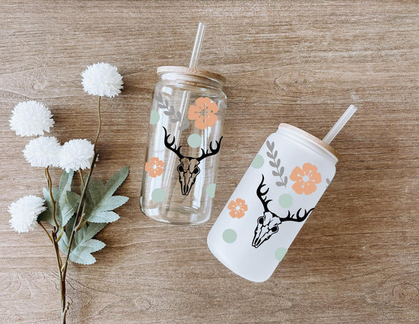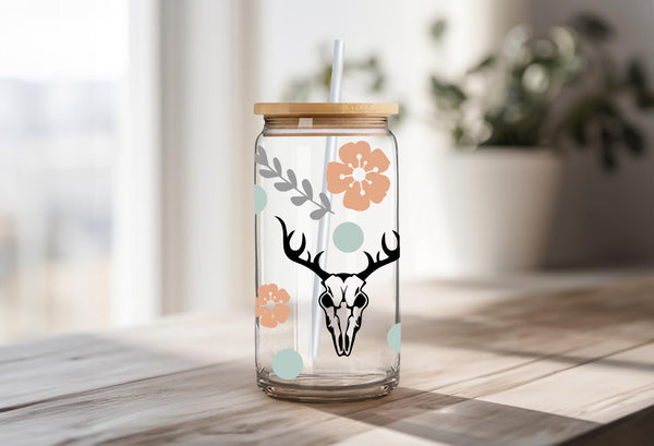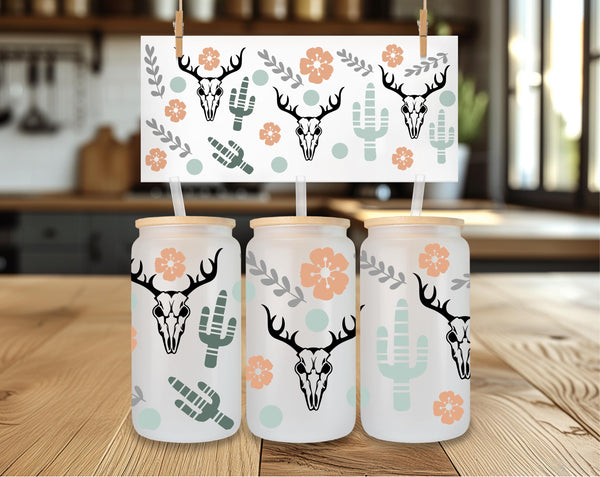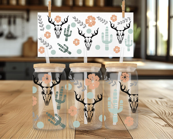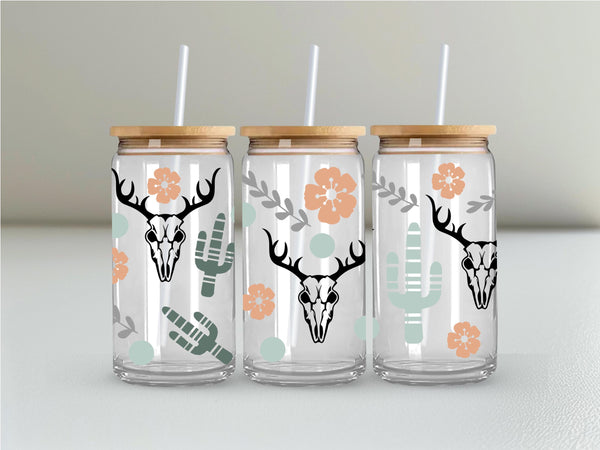 Design: Full-wrap, repeating pattern featuring deer skulls, cactus, and boho floral accents.