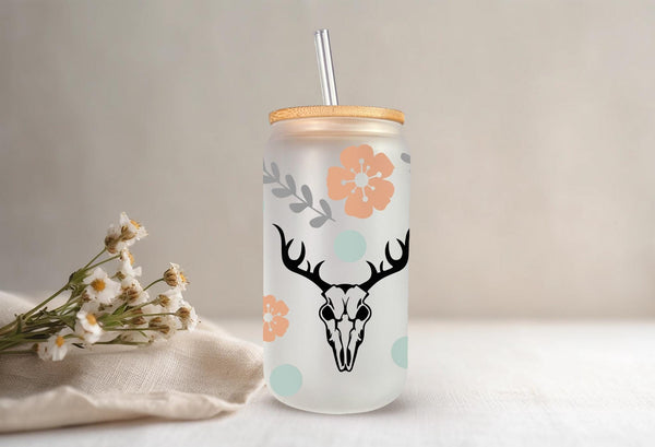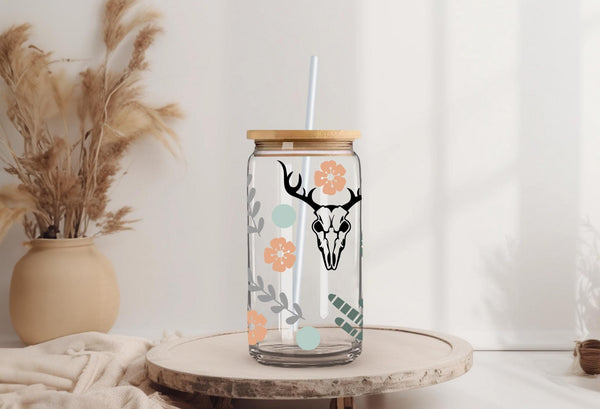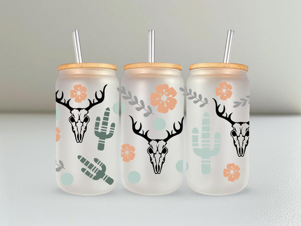 Bring the desert spirit to your daily drinks with this stylish, can-shaped glass tumbler! This unique piece features a repeating pattern that beautifully blends rustic Western motifs with soft bohemian colors.