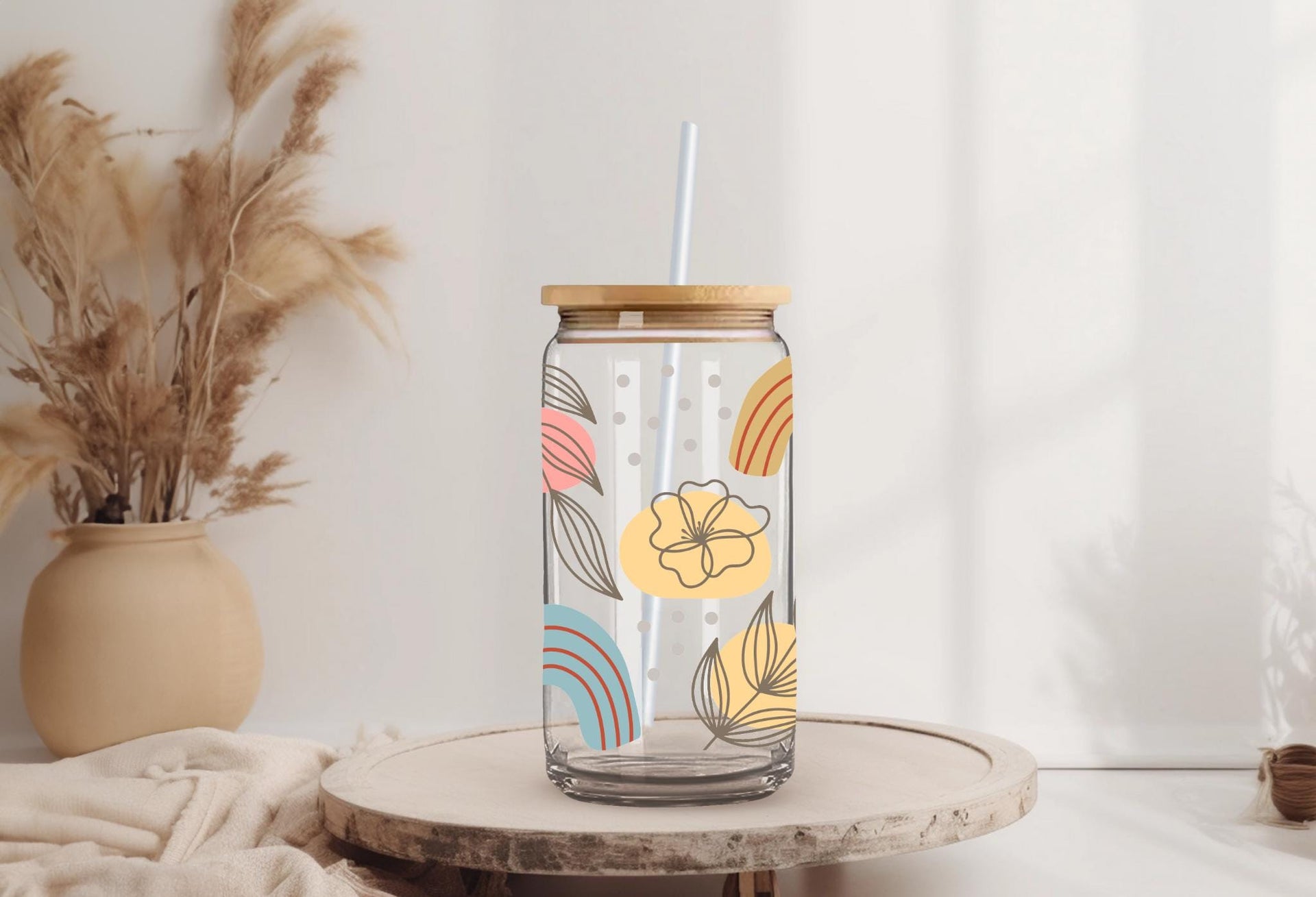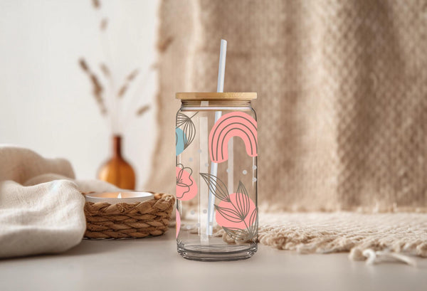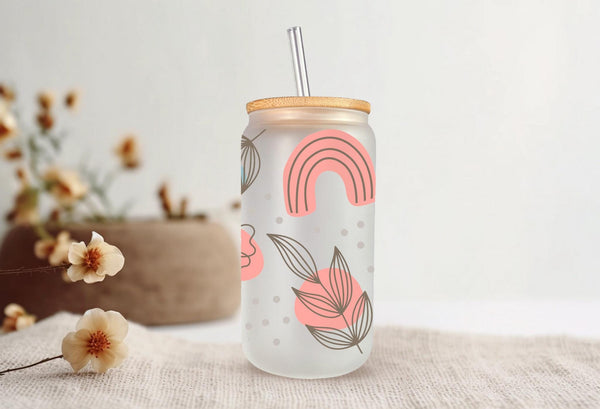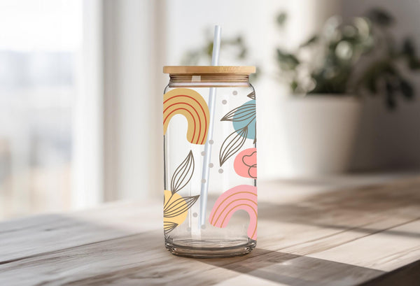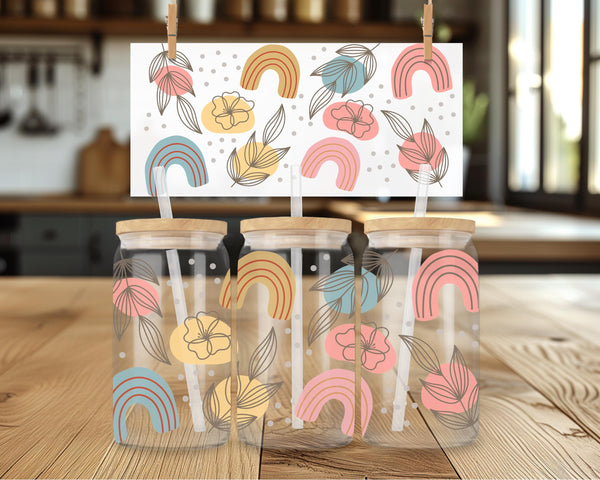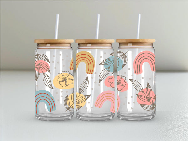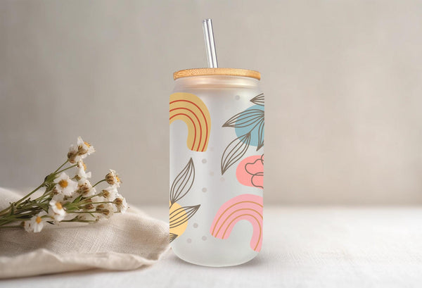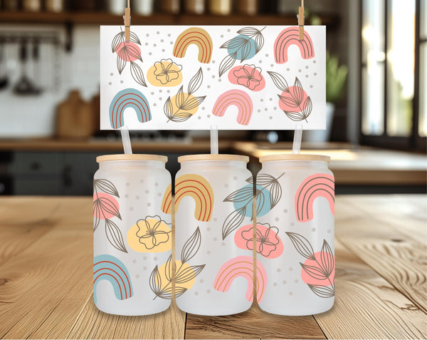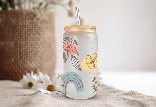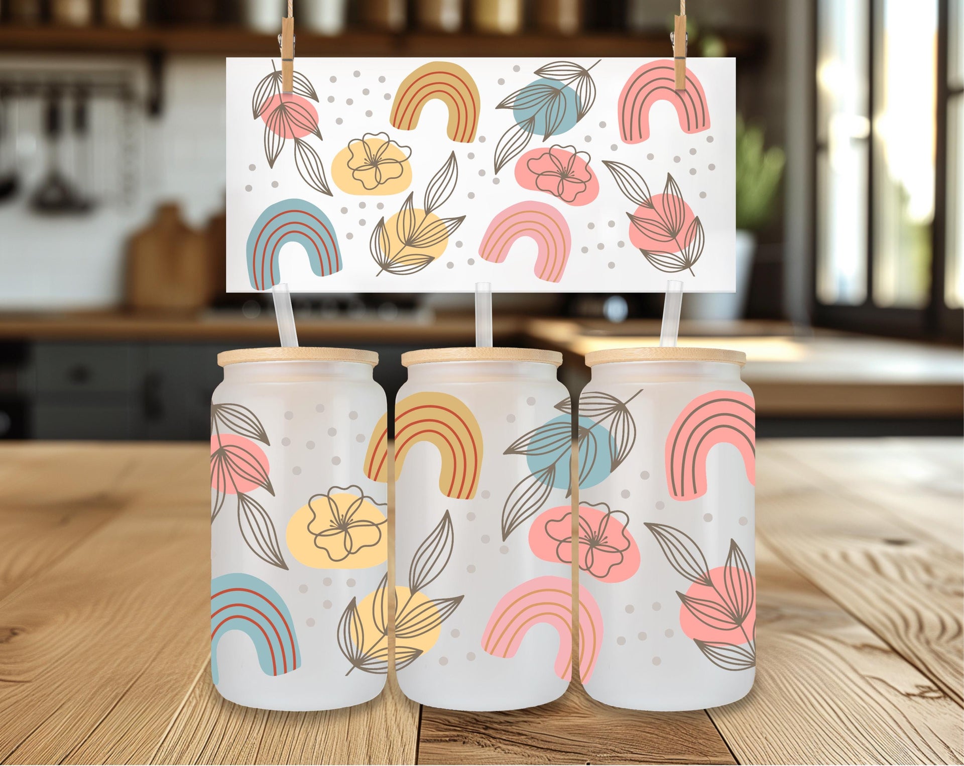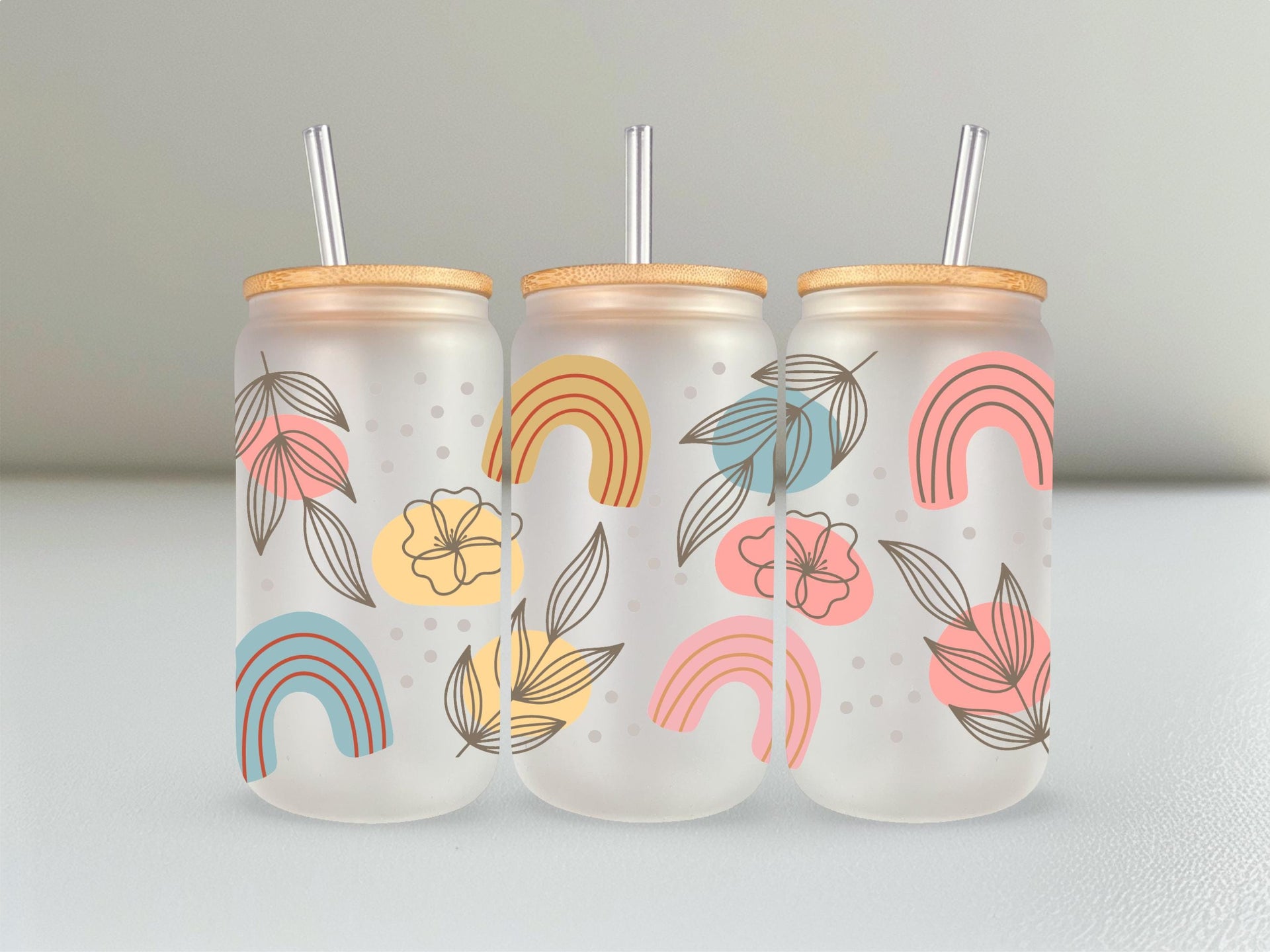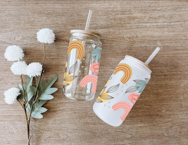 Indulge in a dreamy drink experience with our Pastel Rainbows Glass Cup. Sip in style with the 16oz cup, available in clear or frosted. Let the beautiful pastel rainbows dance on your taste buds and add a touch of magic to your day!