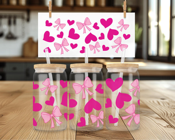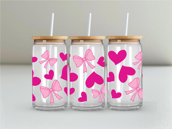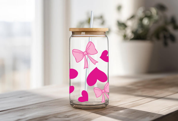 Bows and Hearts Glass Tumbler: 16oz Beer Can Glass with Bamboo Lid