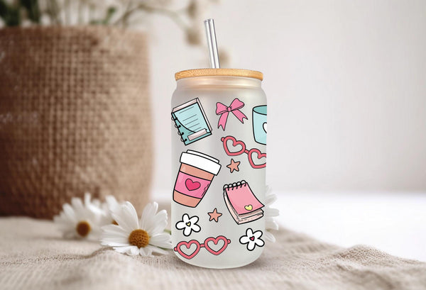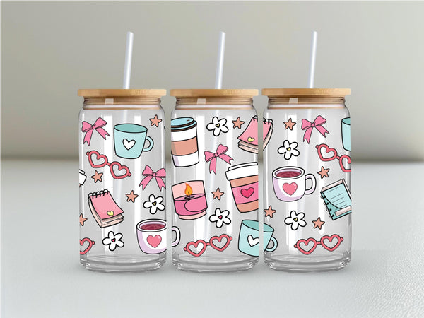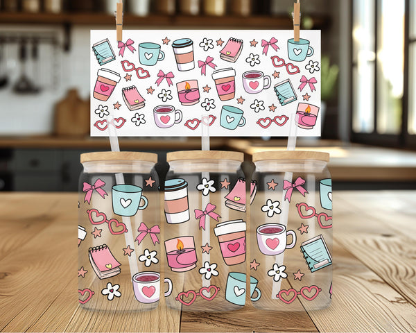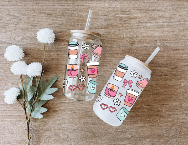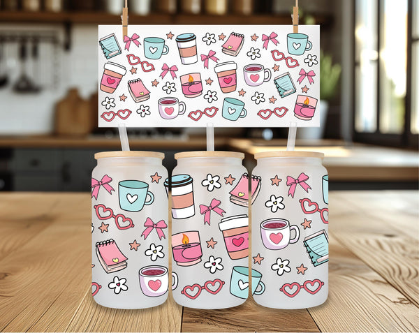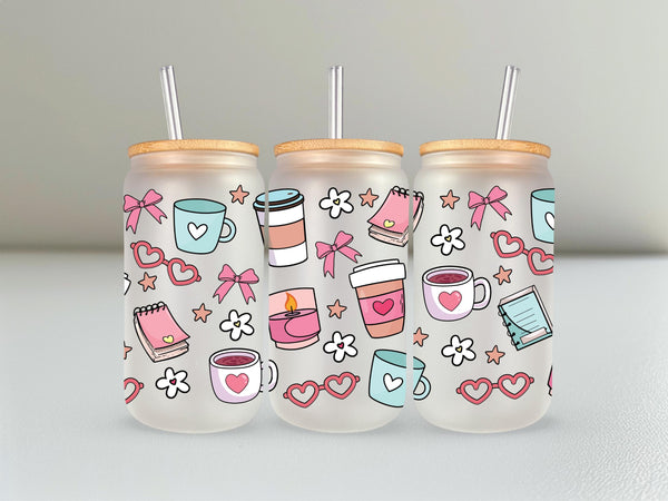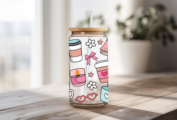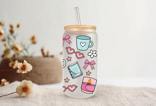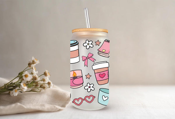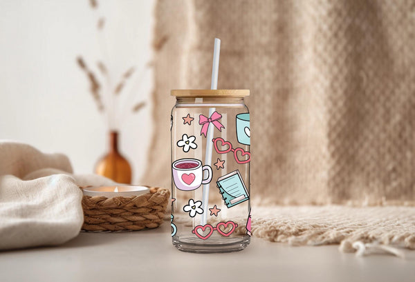 Celebrate the small, cozy joys of life with this adorable can-shaped glass tumbler! This full-wrap design features a charming, repeating pattern of things that make self-care and relaxation perfect.