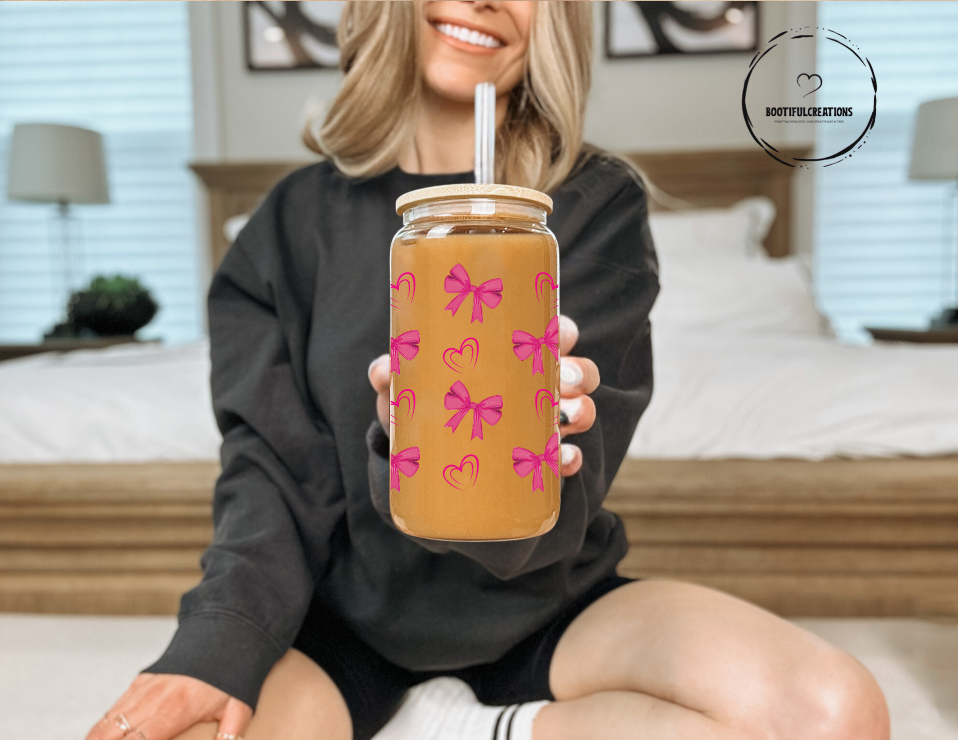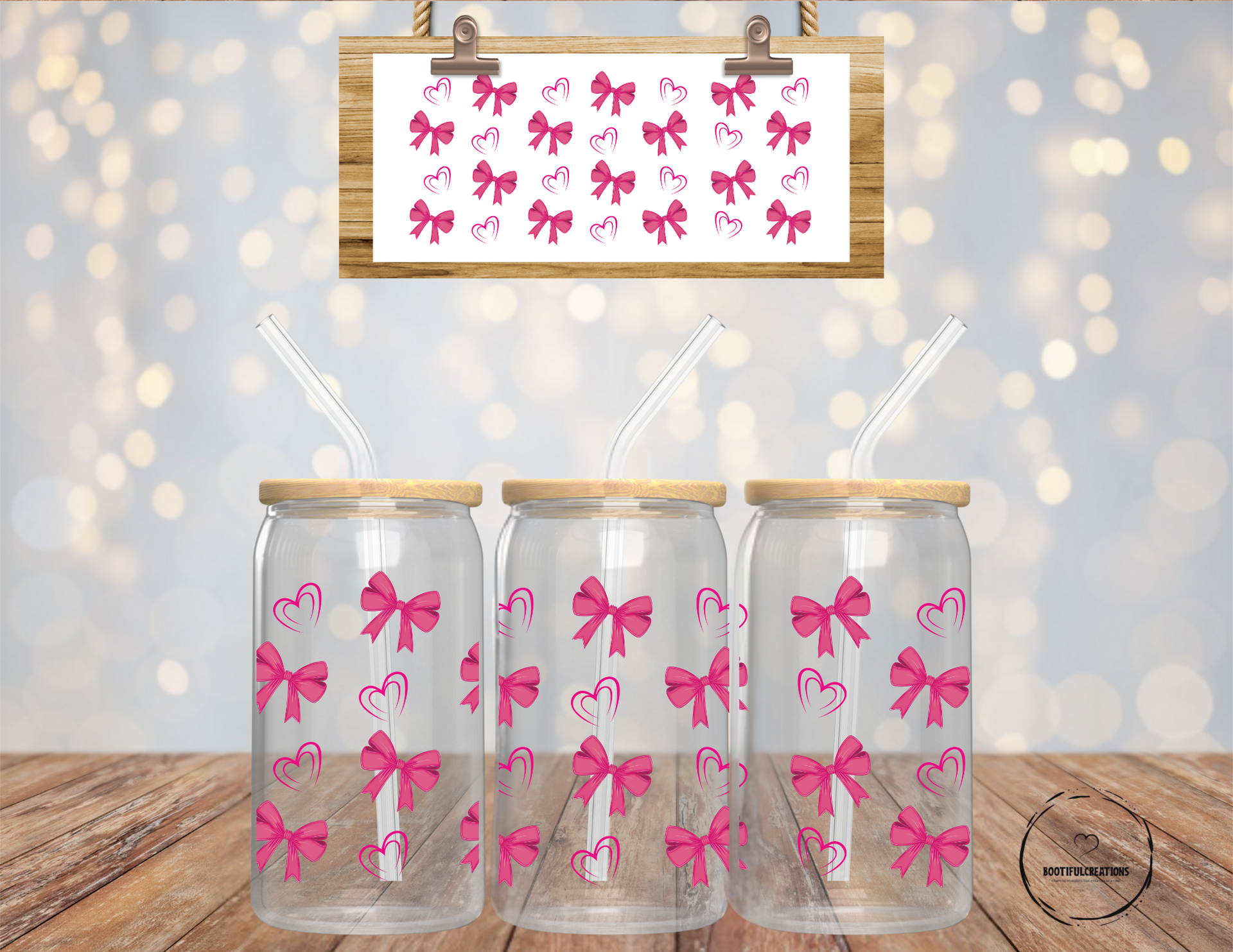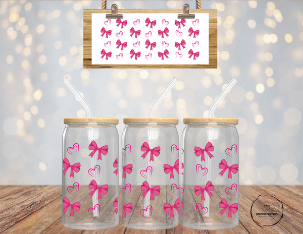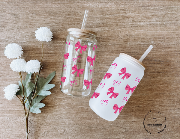 Elevate your beverage experience with our Dark Pink Bows and Double Outlined Hearts Glass Cup. Adorned with charming dark pink bows and elegant double outlined hearts, this 16oz cup adds a touch of sophistication to any drink. Enjoy your beverage in clear or frosted style, while feeling inspired and delighted.