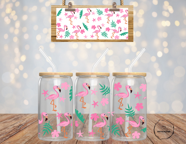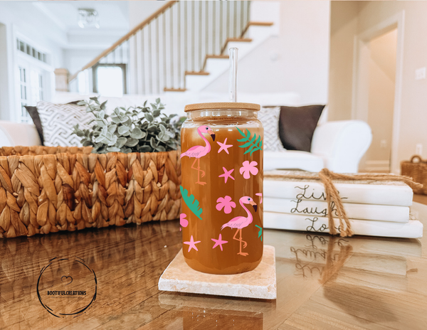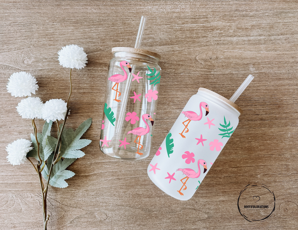 Indulge in your drink of choice with our Flamingo Glass Cup! With its vibrant flamingo pattern, this 16oz glass cup is sure to brighten up any beverage. Choose between a clear or frosted finish and enjoy your drink in style. Perfect for any flamingo lover or as a gift for someone special.