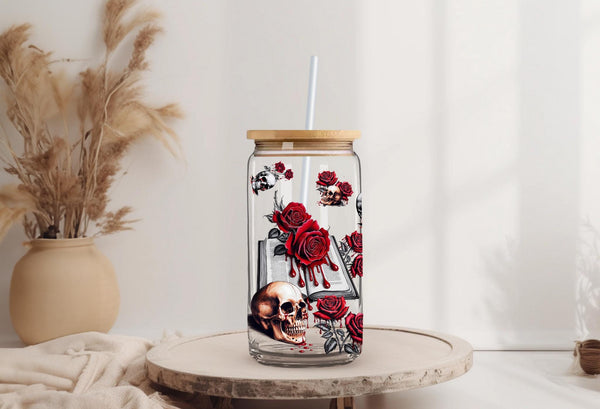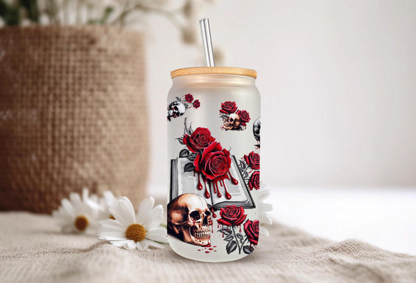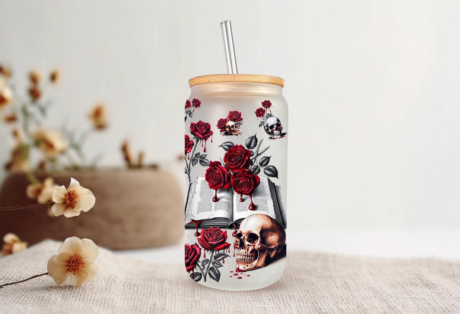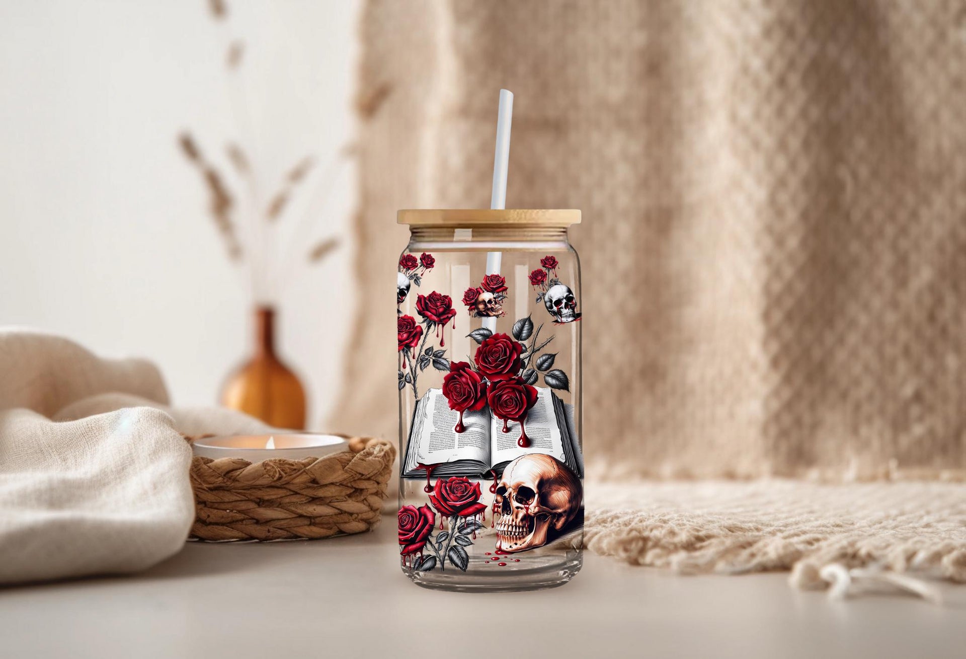 Gothic Skull & Roses Can Glass Tumbler – Dark Romance Bookish Gift
