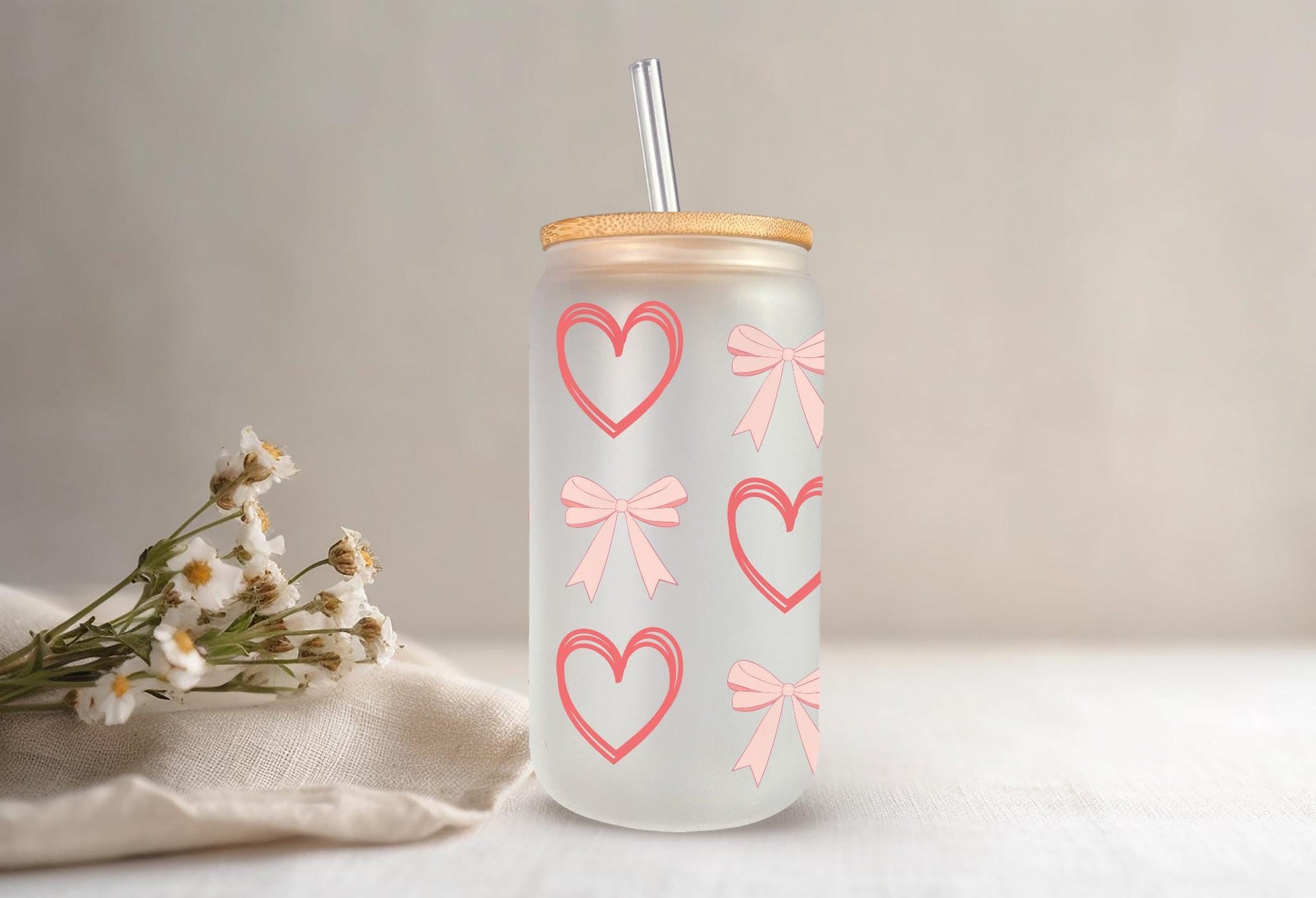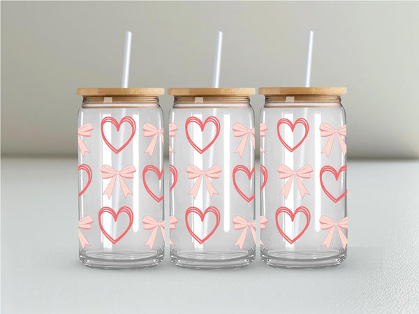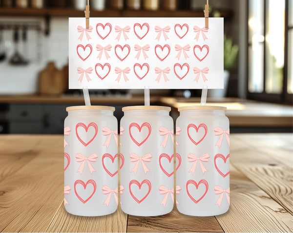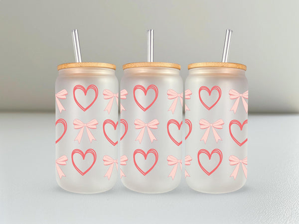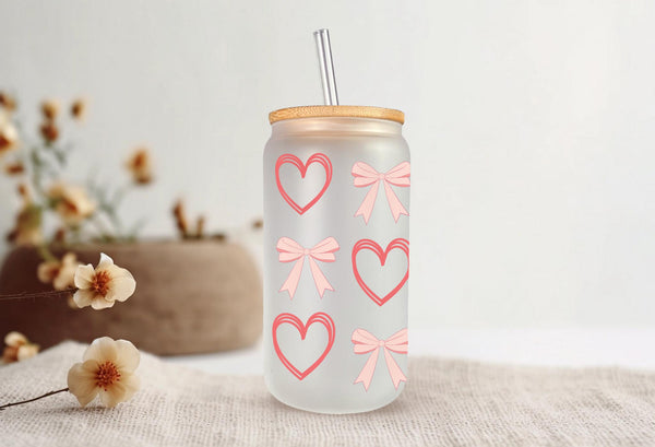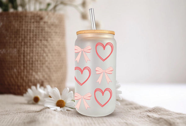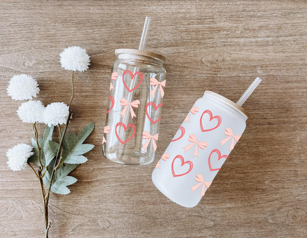 Add a touch of sweetness to your daily routine with our Peach Bows and Outlined Hearts Glass Cup! Made with durable 16oz glass and featuring charming peach bows and outlined hearts, this cup is perfect for sipping your favorite drink. Choose from clear or frosted for a unique and stylish addition to your collection.