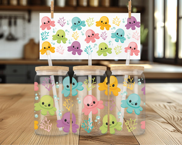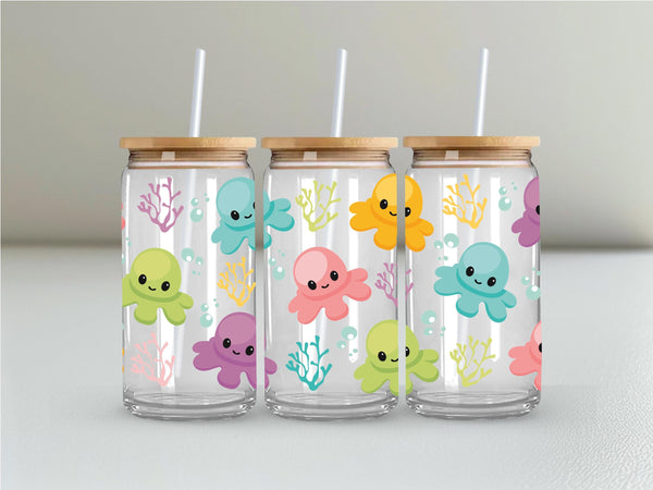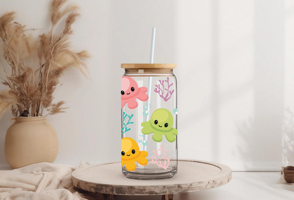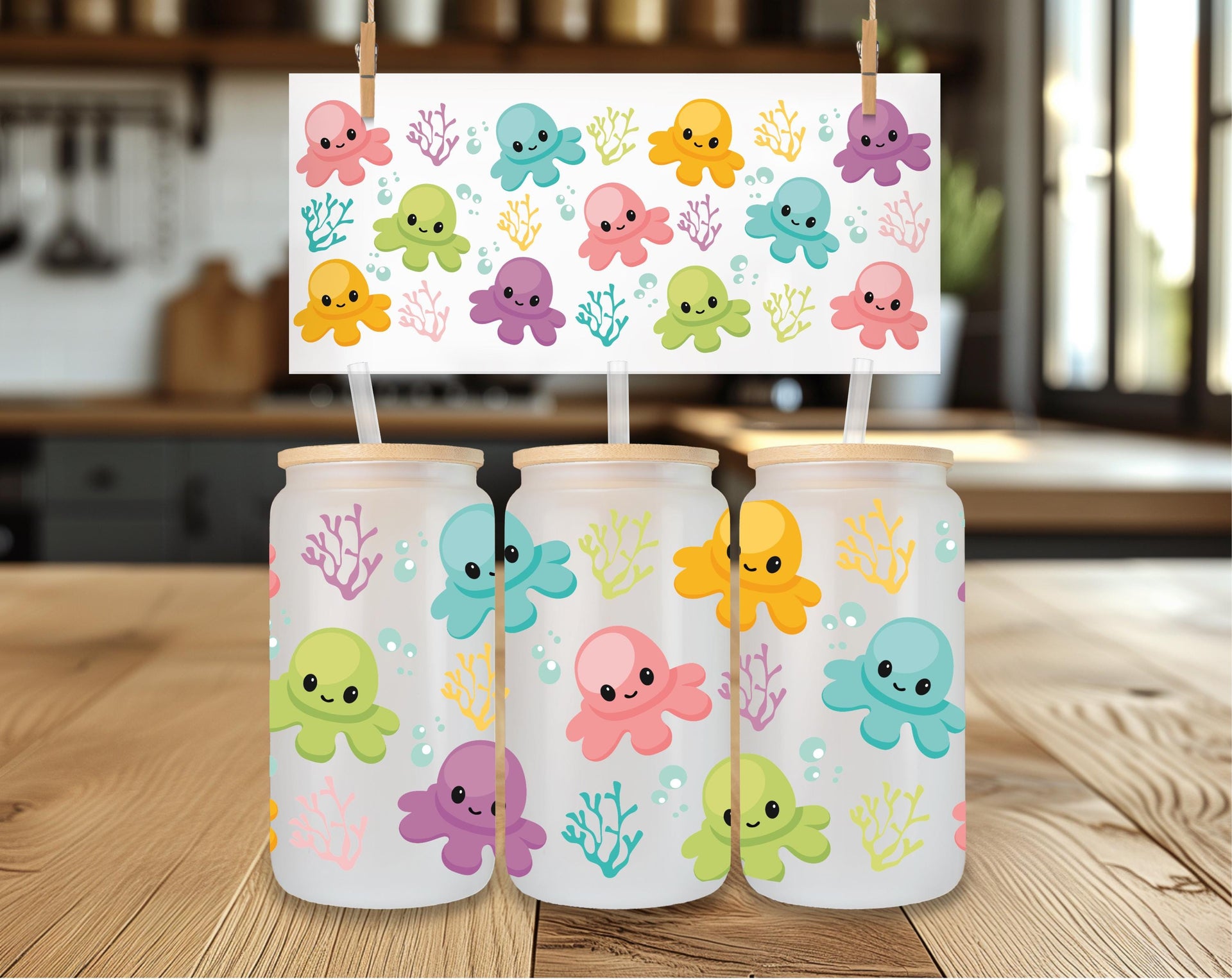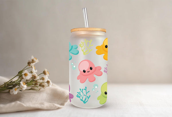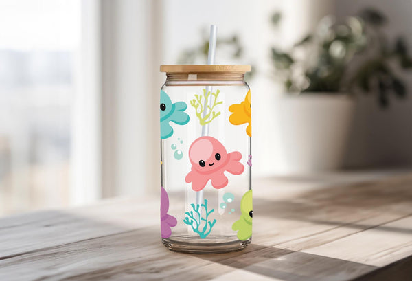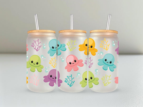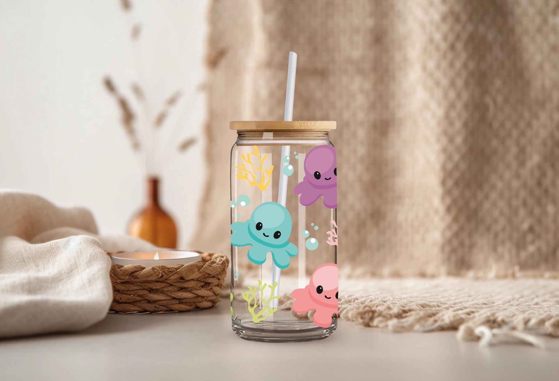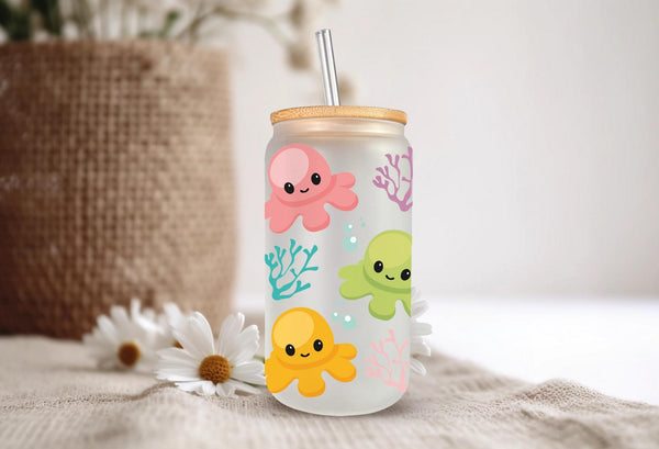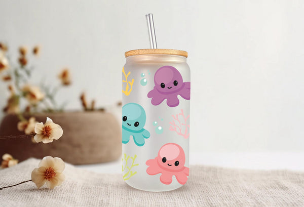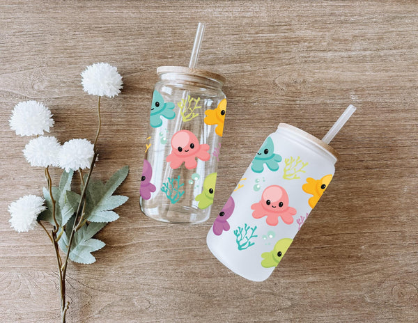 Bring a splash of color to your kitchen with our Octopus Glass Cup! With colorful octopus designs, this 16oz cup comes in both clear and frosted options. Perfect for enjoying your favorite beverage, this cup is sure to bring joy to your daily routine.