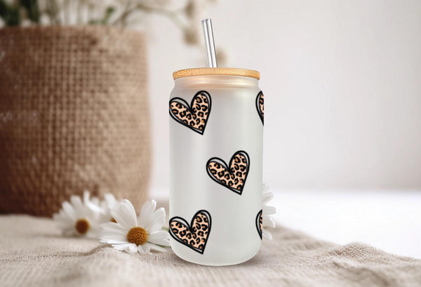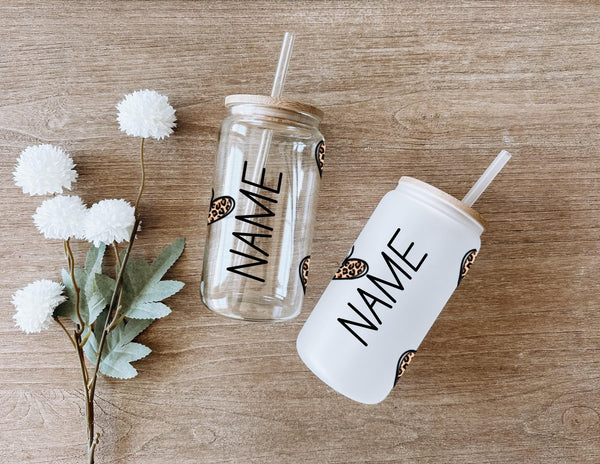 Leopard Heart Glass Tumbler: Personalized Iced Coffee Cup with Lid & Straw