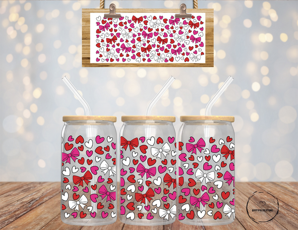 Fall in love with our Lots of Love Glass Cup! Adorned with red, white, and pink bows and hearts, this 16oz cup is perfect for sharing a special moment with a loved one. Choose between a clear or frosted design, perfect for adding a touch of romance to any drink. Cheers to love!
