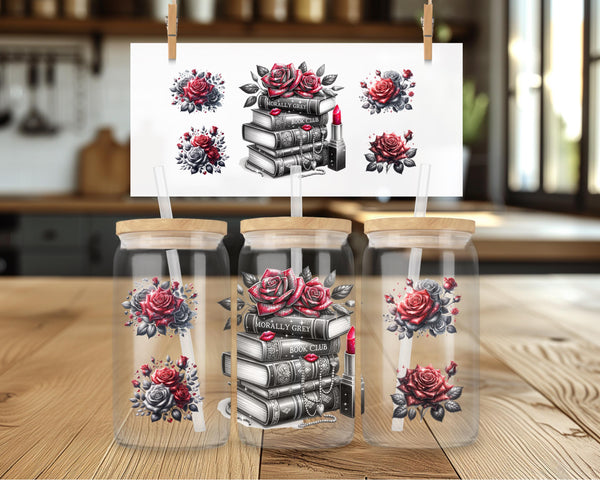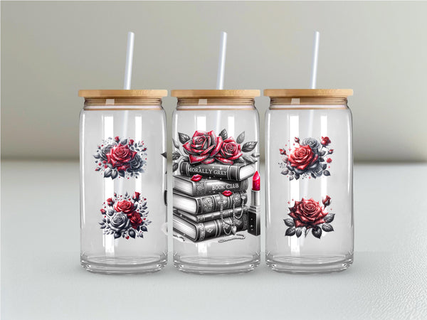 The central graphic features a detailed stack of vintage books topped with vibrant red roses, a silver chain, and a crimson lipstick. The spines boldly declare "Morally Grey" and "Book Club," making a clear statement about your reading preferences! Smaller rose and smudge designs surround the main graphic.