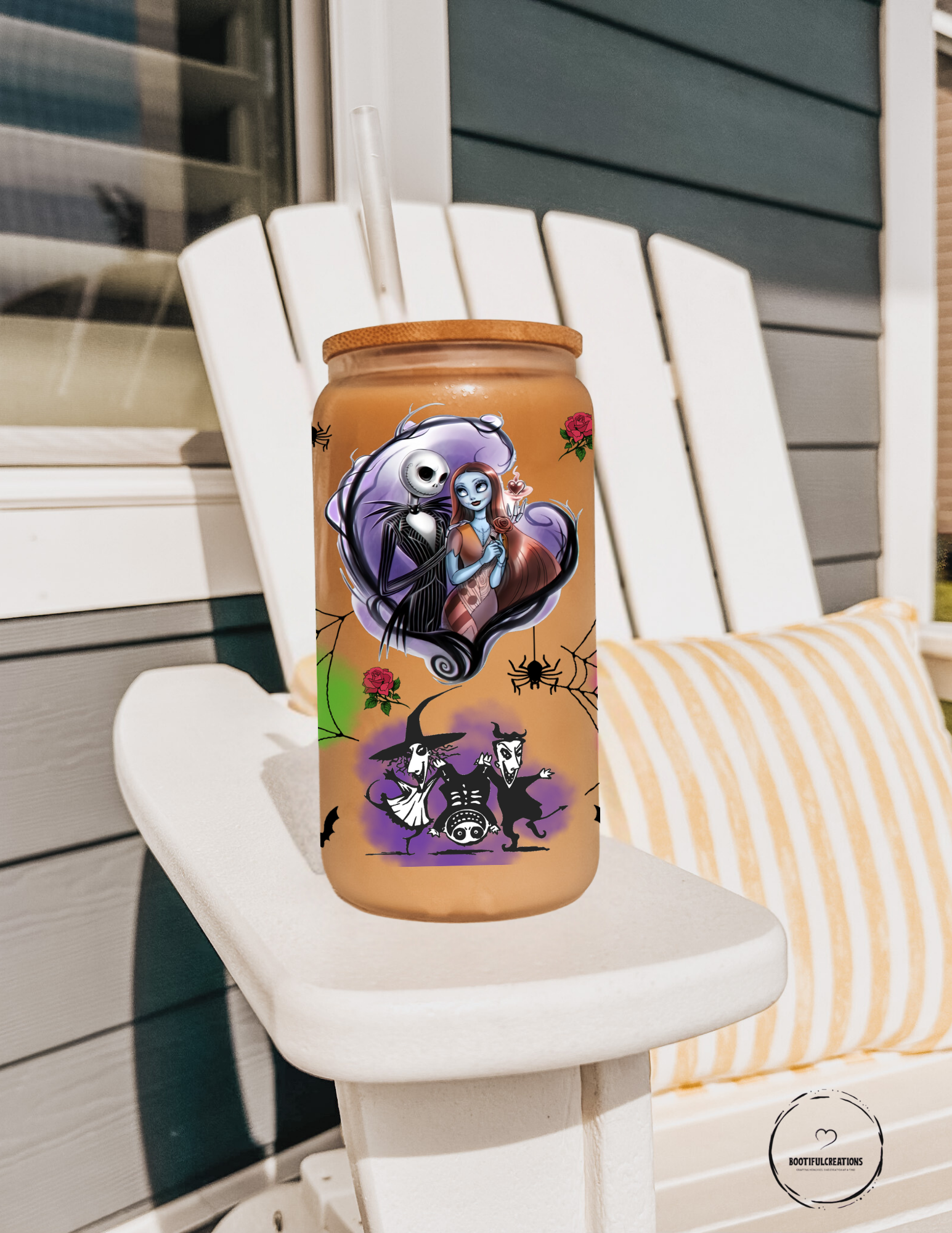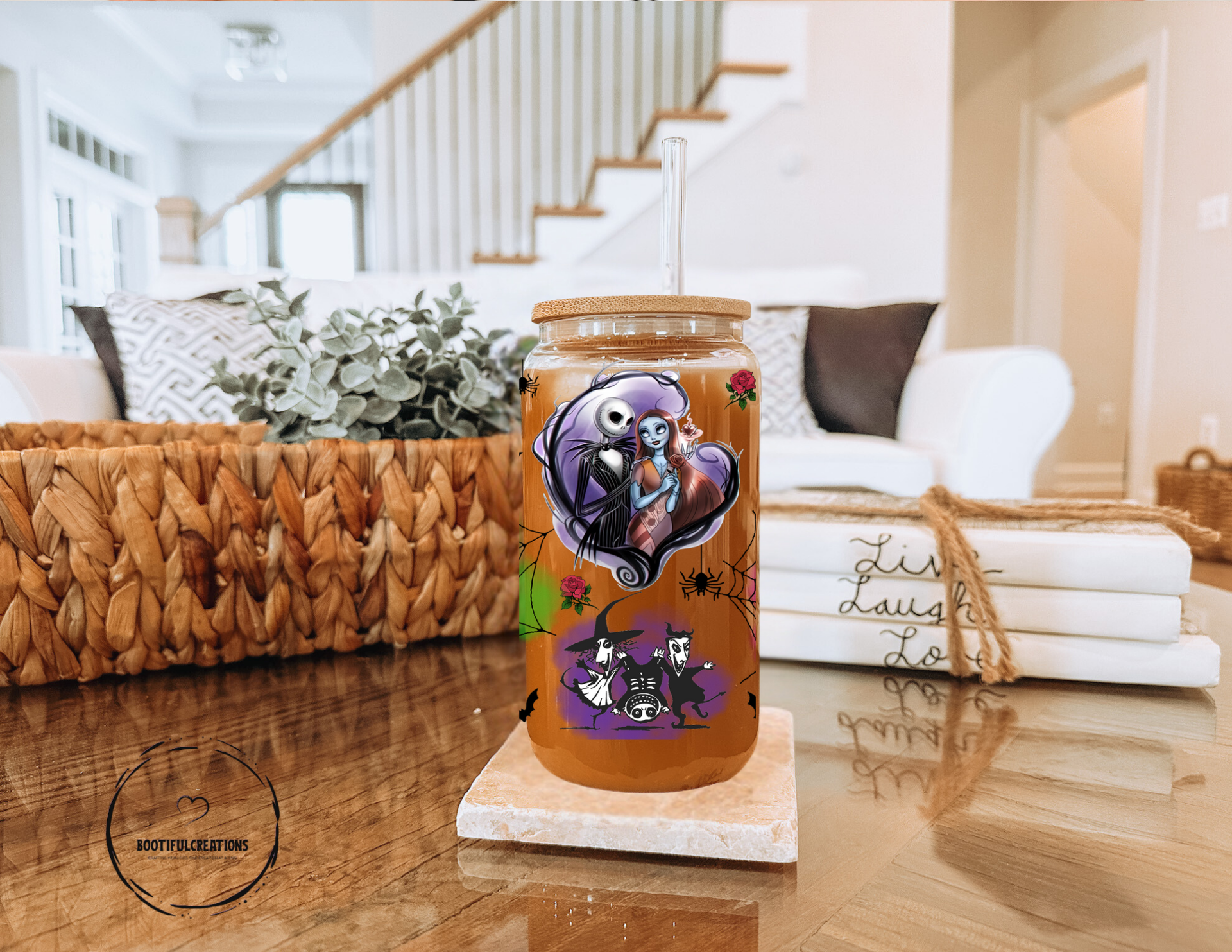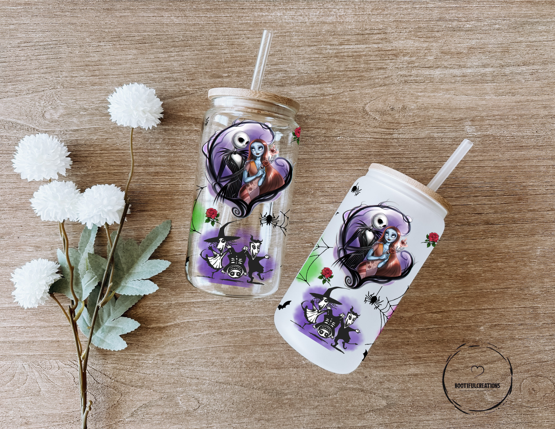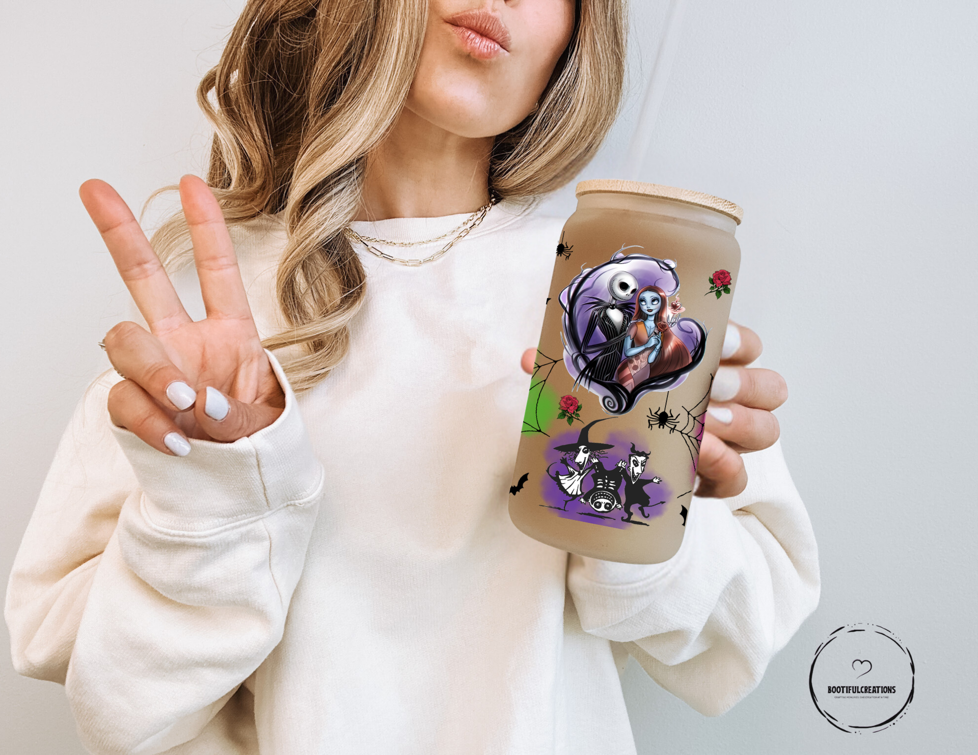 Experience the magic of Halloween and Christmas all year round! Our 16 oz glass cup features the beloved characters Sally, Jack, and Zero from the iconic movie "The Nightmare Before Christmas". Choose between a clear or frosted cup and add a touch of nostalgia to your everyday drinkware.