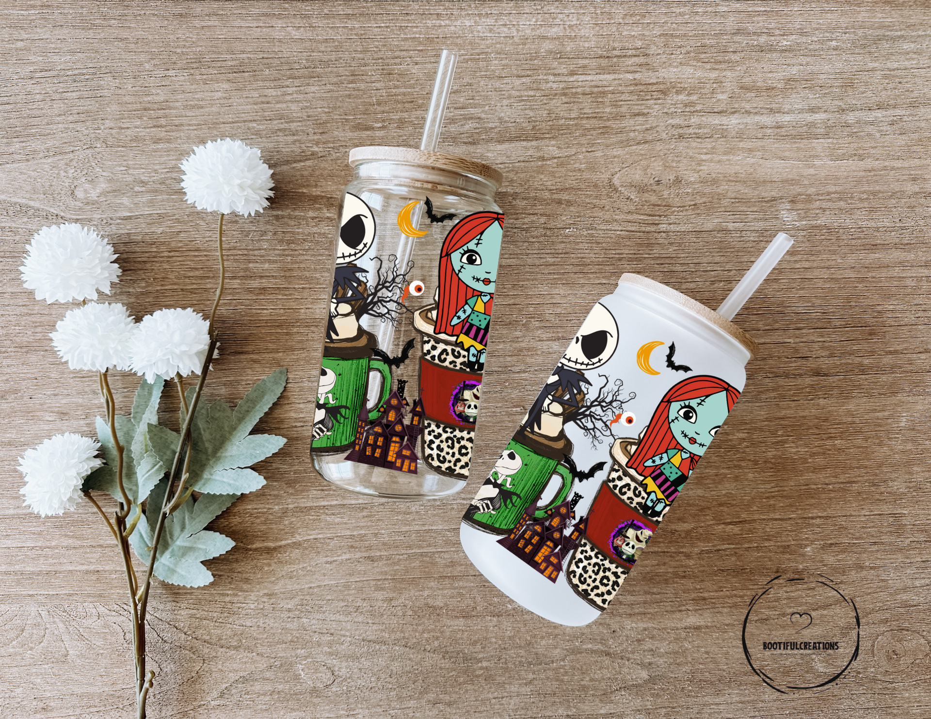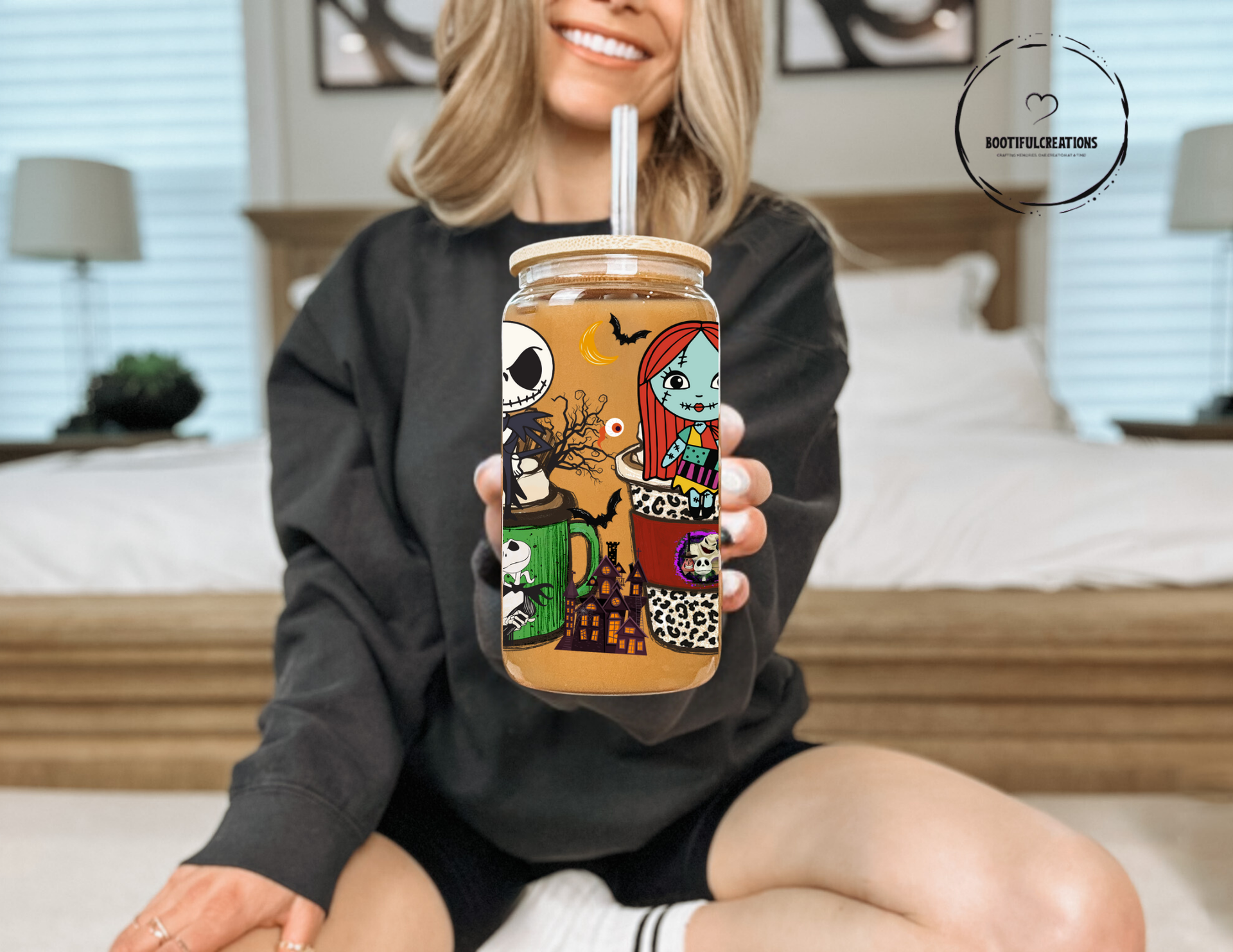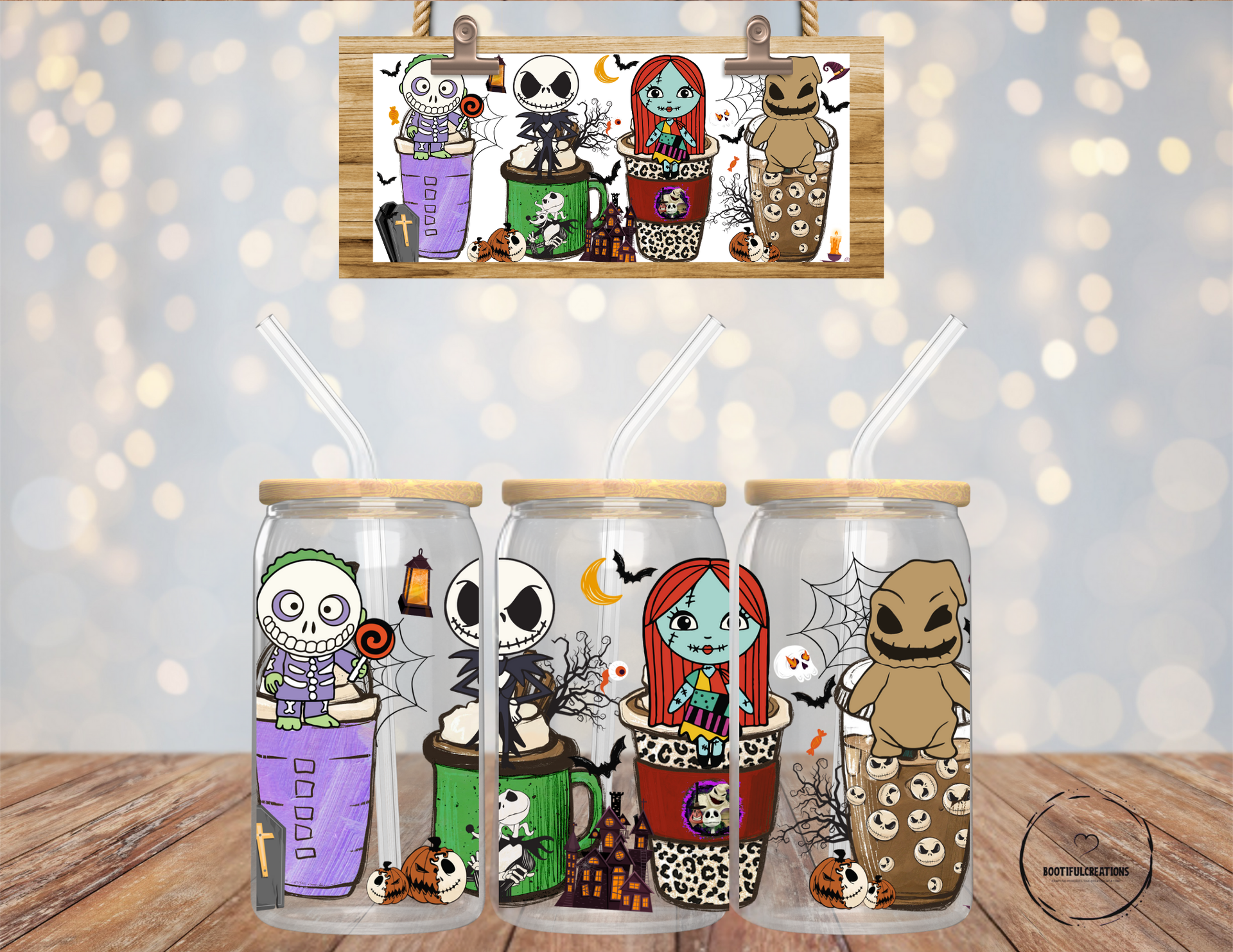 Get ready for a spooky night with our Nightmare Before Christmas 16oz glass cup! Featuring your favorite characters - Barrell, Jack, Sally, and Oogie Boogie - this cup is perfect for any fan. Choose from clear or frosted glass, and enjoy your drink in style. Don't miss out on this must-have for any Halloween party!