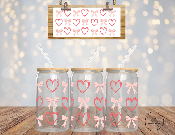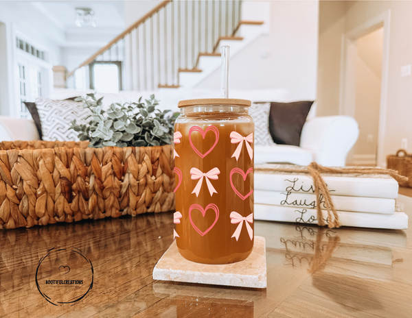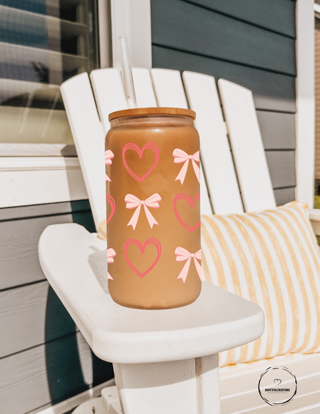 Add a touch of sweetness to your daily routine with our Peach Bows and Outlined Hearts Glass Cup! Made with durable 16oz glass and featuring charming peach bows and outlined hearts, this cup is perfect for sipping your favorite drink. Choose from clear or frosted for a unique and stylish addition to your collection.