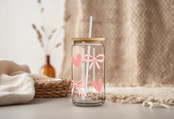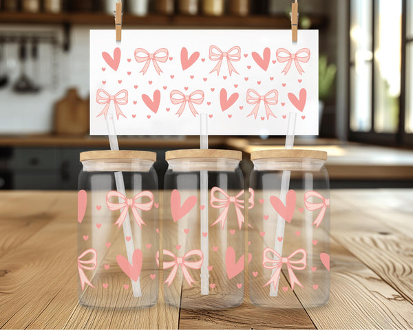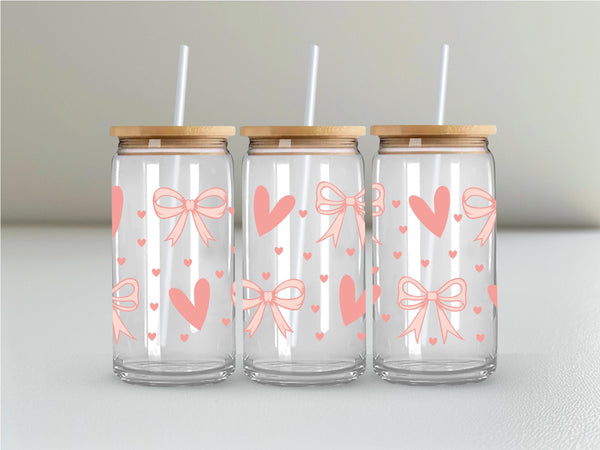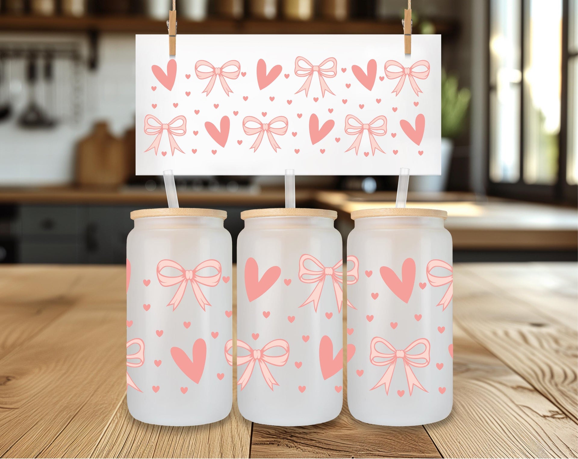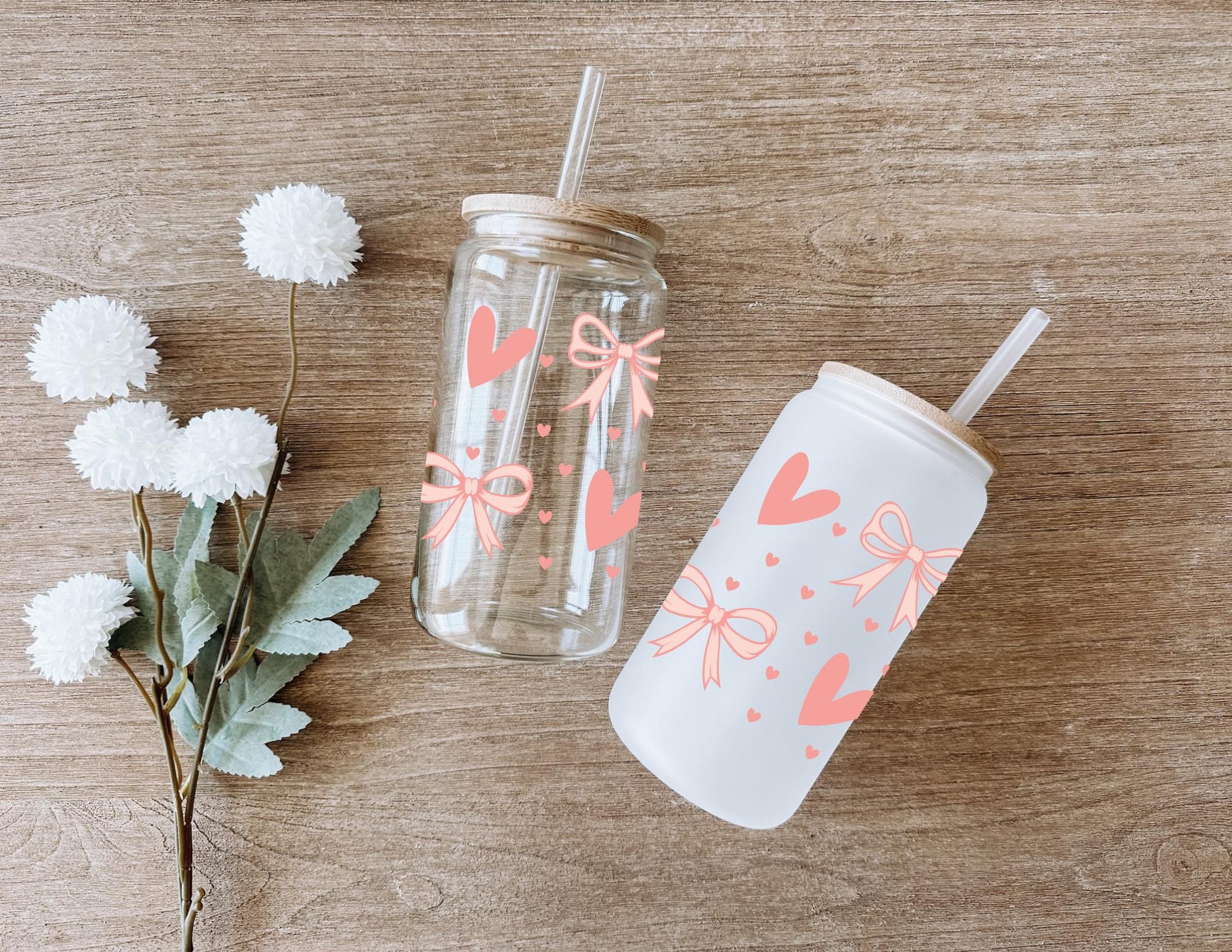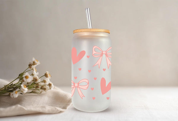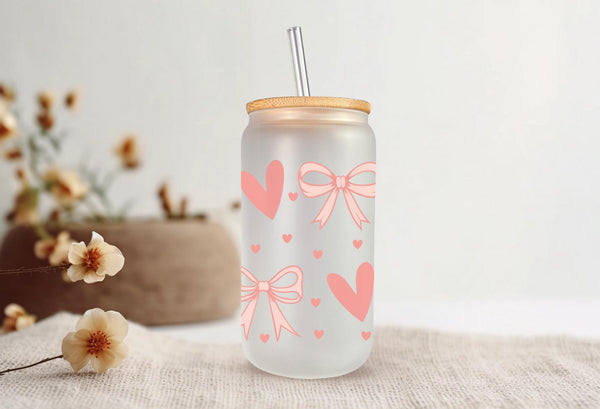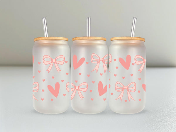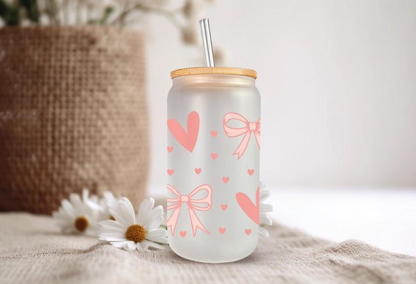 Indulge in a cup of cheer with our Peach Hearts and Bows Glass Cup! Sip from a stunning 16oz glass vessel adorned with delicate peach hearts and bows, available in clear or frosted. Perfect for adding a touch of charm to any beverage.
