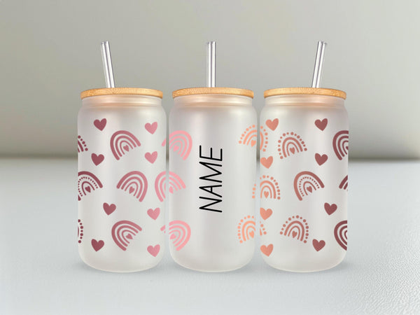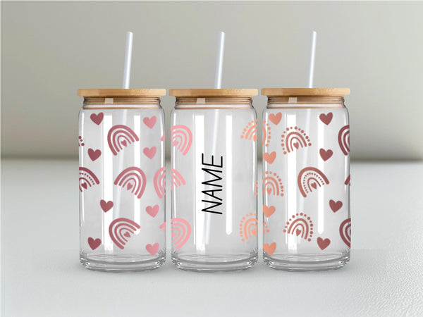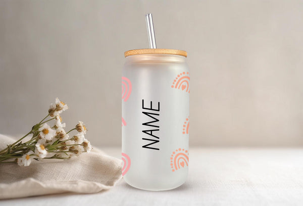 Sip in style with this adorable Personalized Boho Rainbow Glass Can!