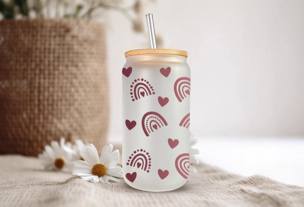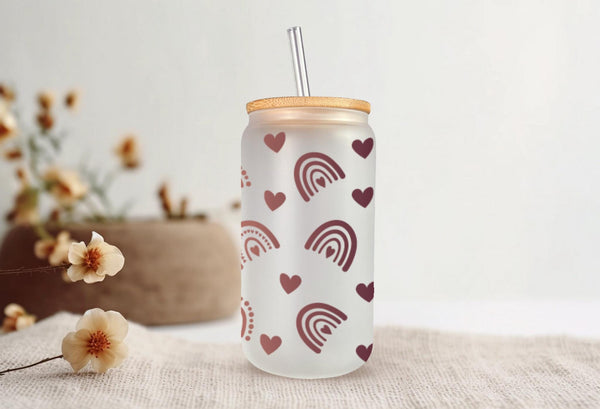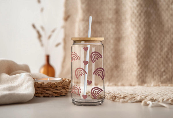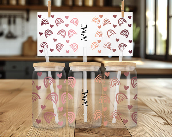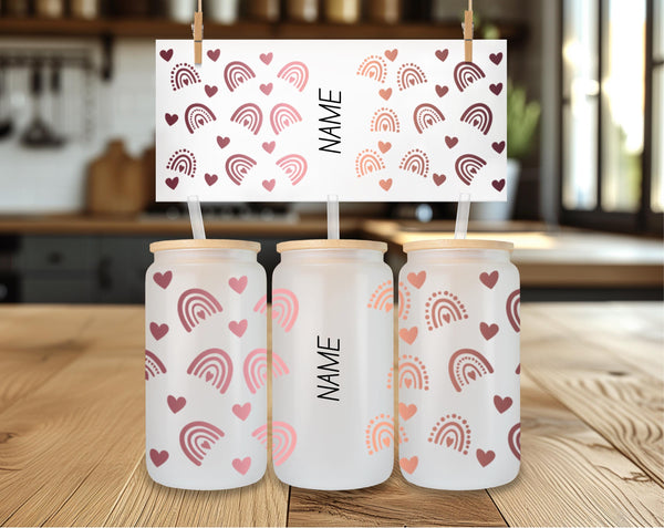 Add a splash of aesthetic charm to your daily routine. Featuring a trendy pattern of hand-drawn rainbows and hearts in muted pinks, terracotta, and mauve, this glass is perfect for the gal who loves a cozy, boho vibe. Customize it with your name vertically for a personal touch that makes it truly yours.