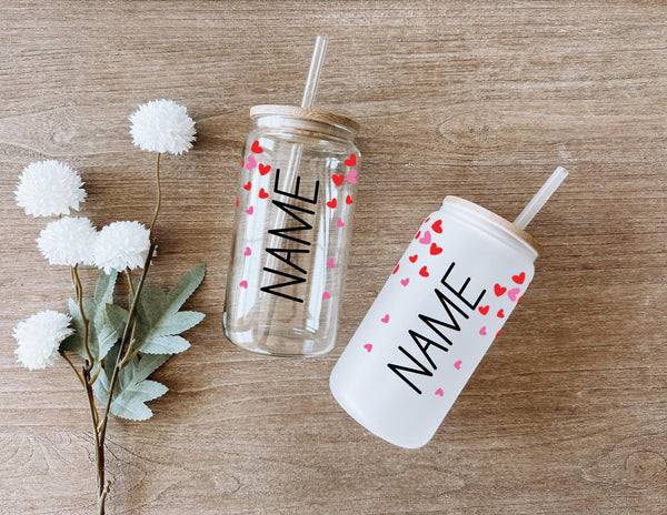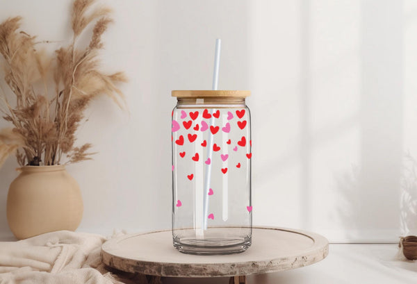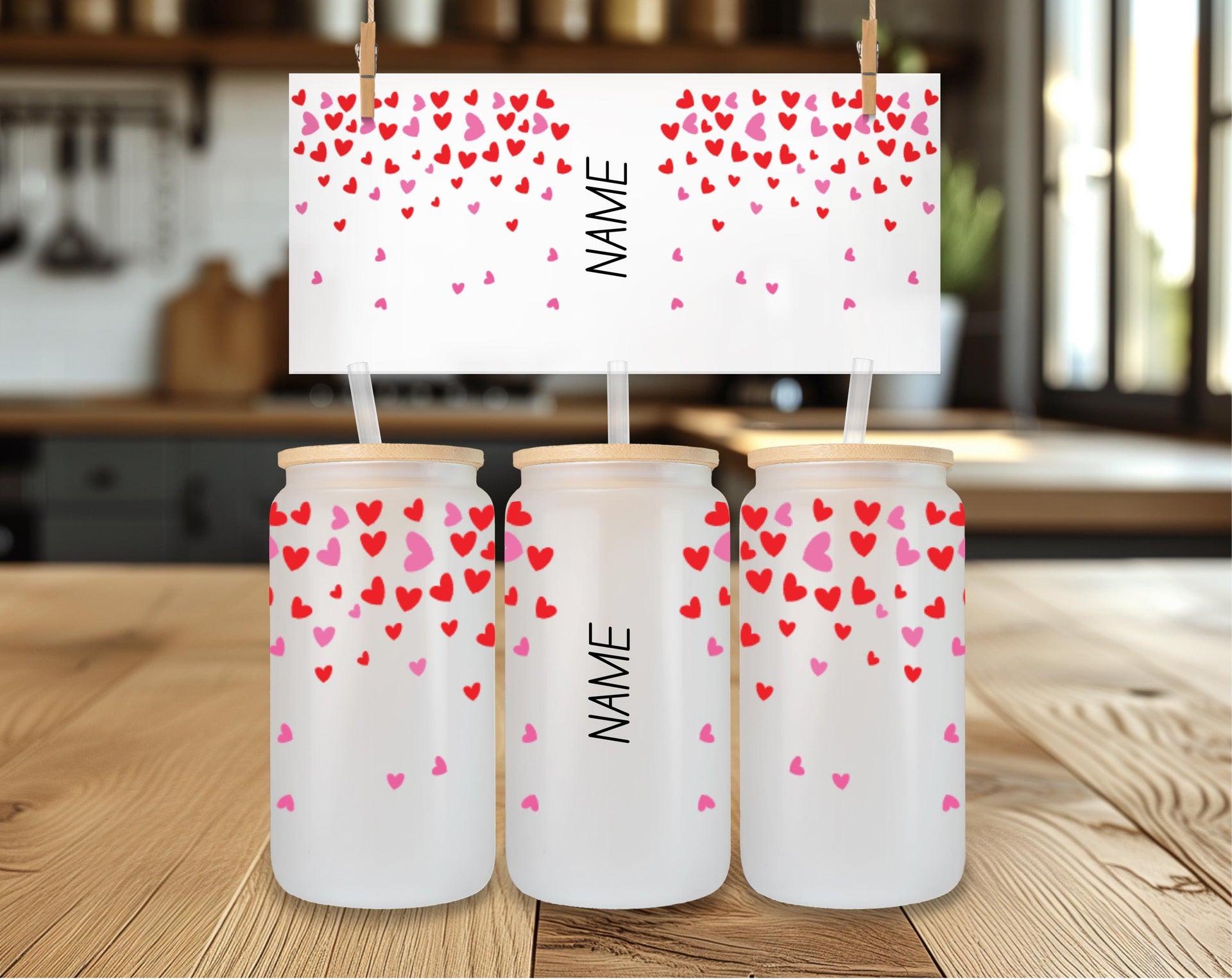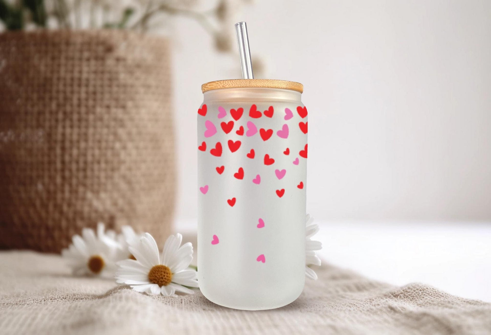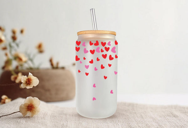 Experience the joy of love with every sip from our Falling Hearts Glass Cup. Adorned with a charming falling hearts design, this 16oz cup can be personalized and comes in both clear and frosted options. Perfect for romantic occasions or as a thoughtful gift for your loved ones.