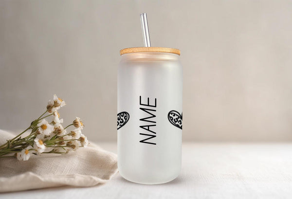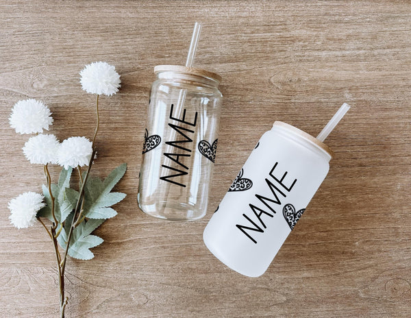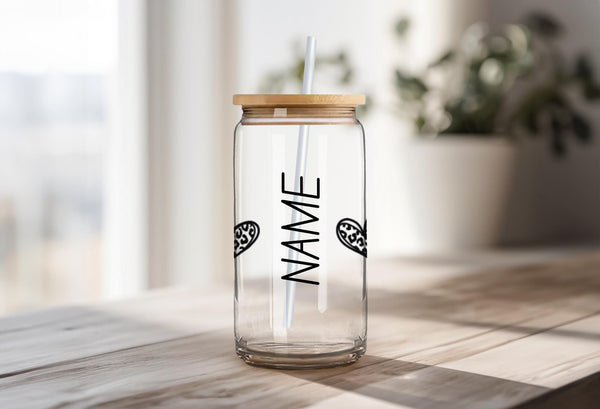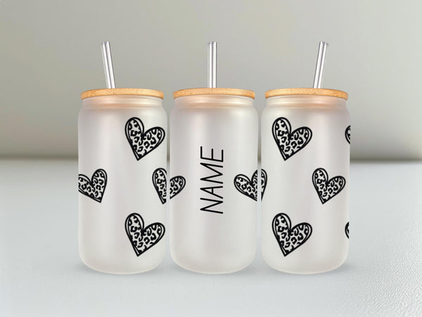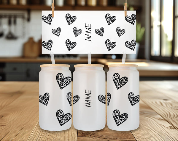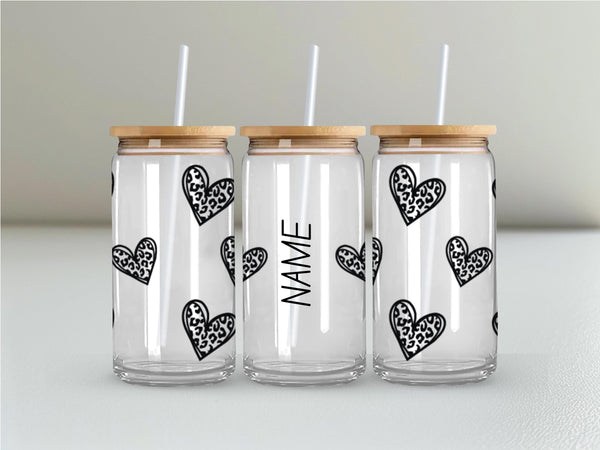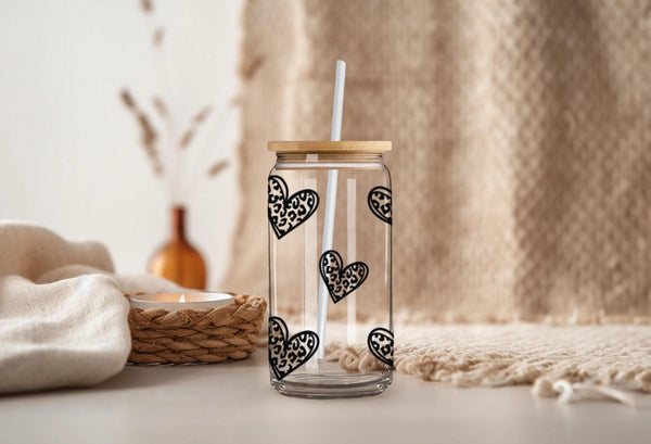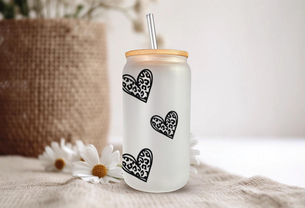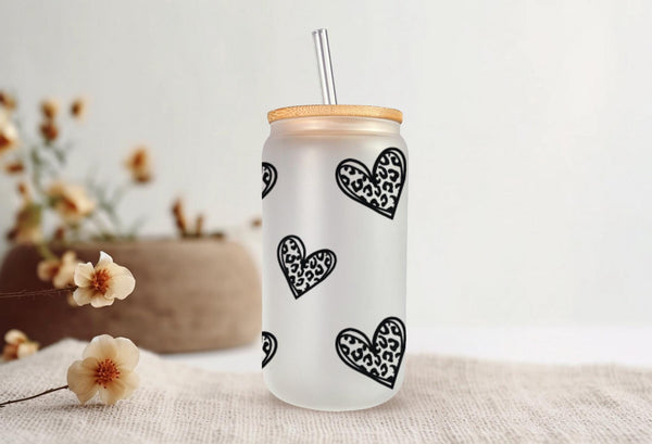 Indulge in your morning coffee or tea with our Clear Leopard Print Glass Cup! Personalize your drink with this 16oz cup, available in clear or frosted. The clear leopard print hearts with a bold black outline add a touch of wild to your daily routine. Sip with style and make a statement!