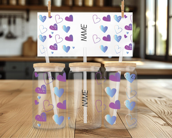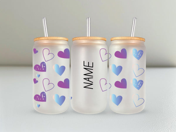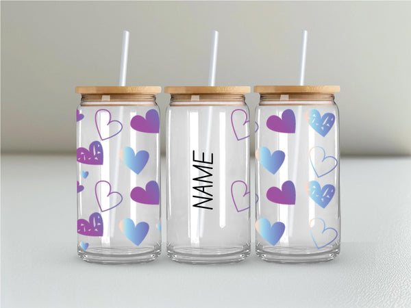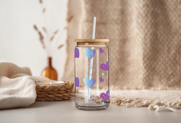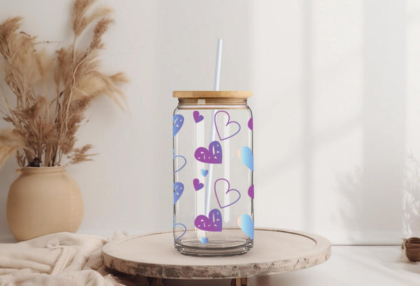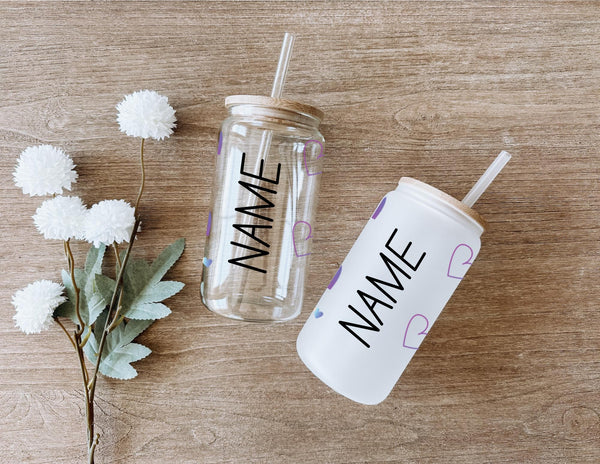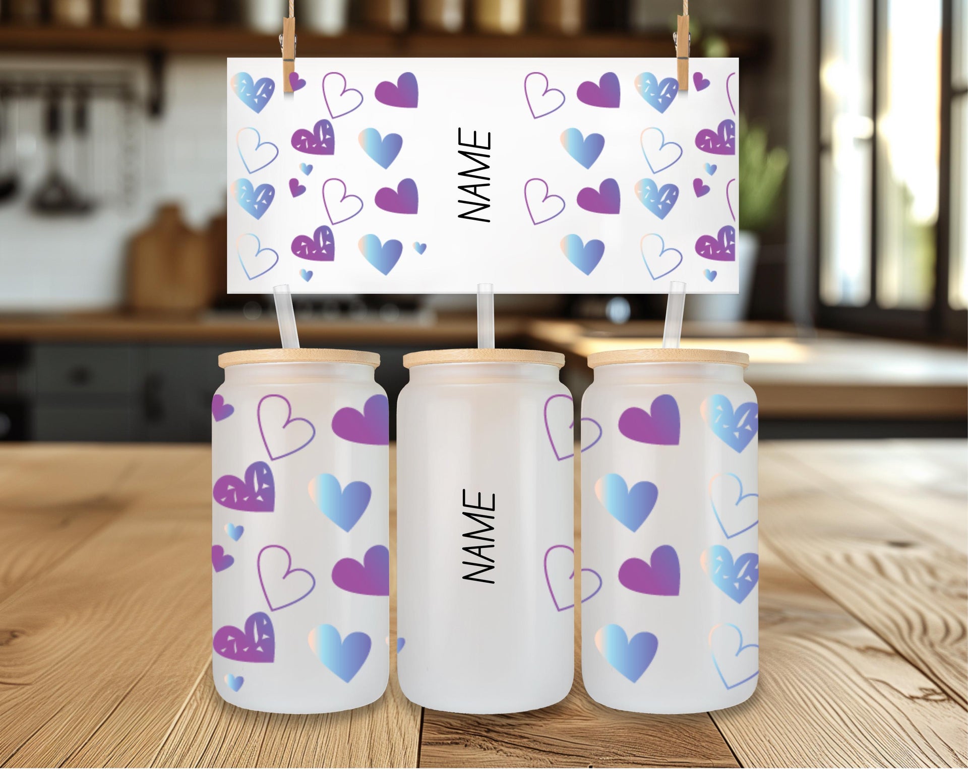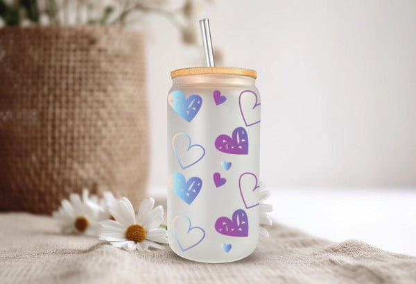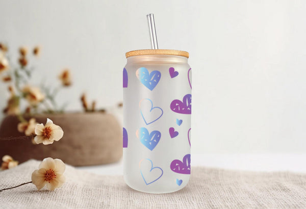 Add a touch of personality to your drinkware collection with our Purple Hearts Glass Cup. This 16oz cup features a unique purple hearts design that can be personalized and is available in both clear and frosted options. Enjoy your favorite beverages in style!