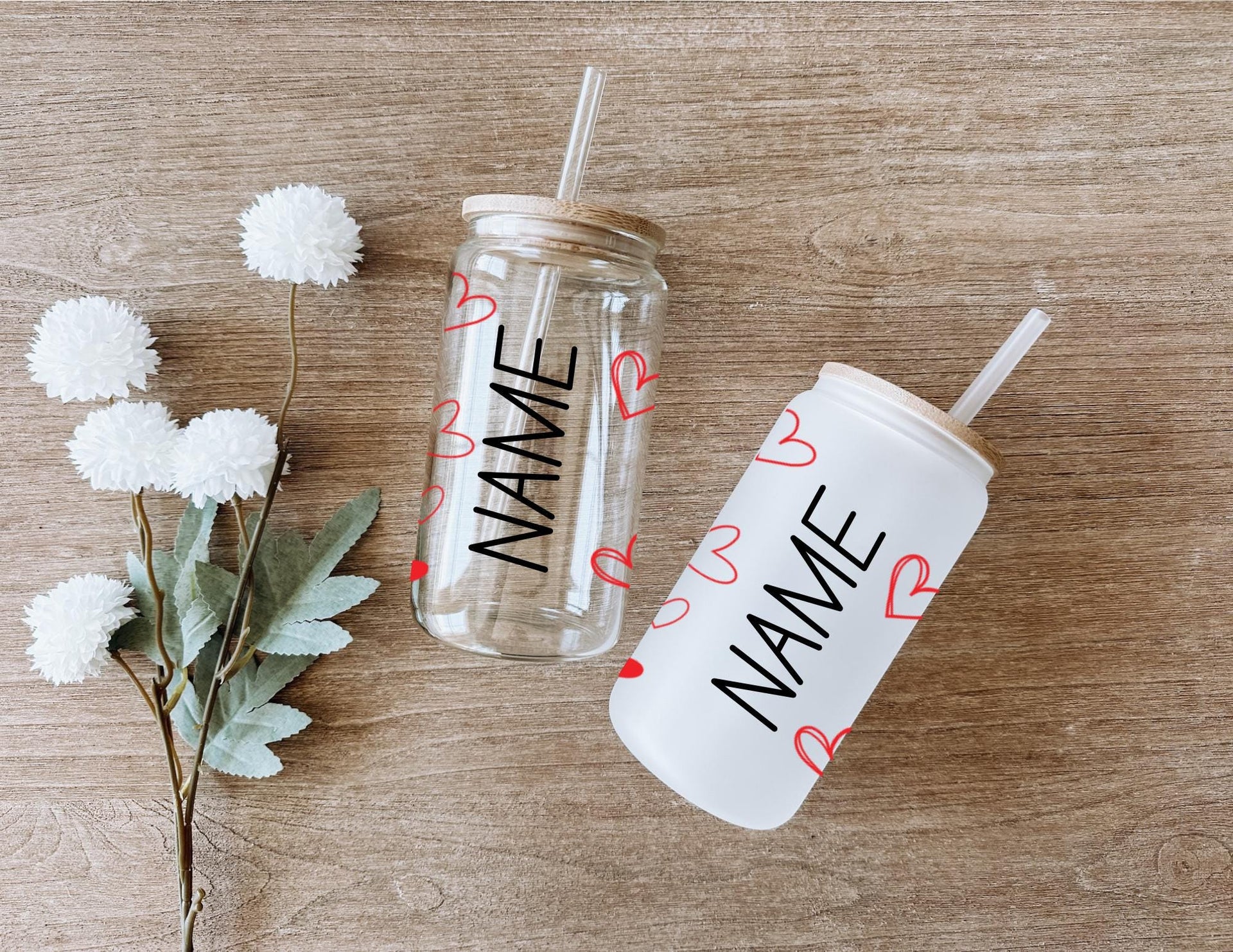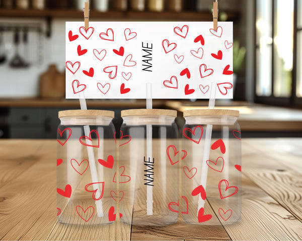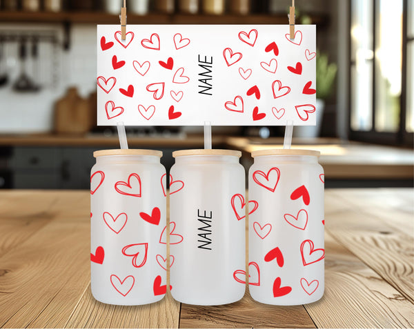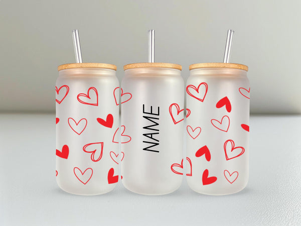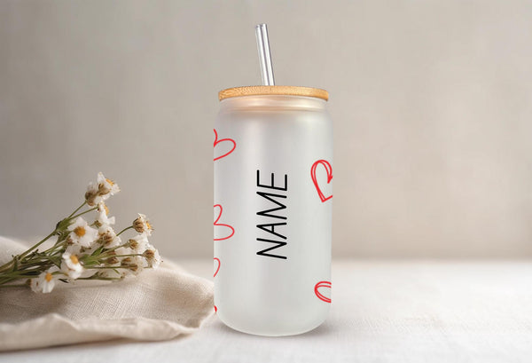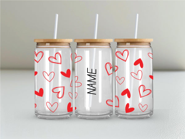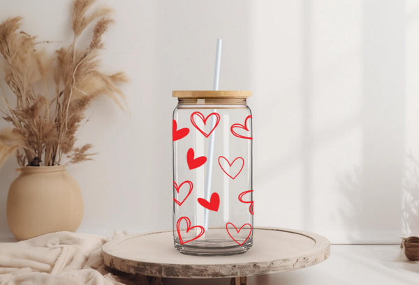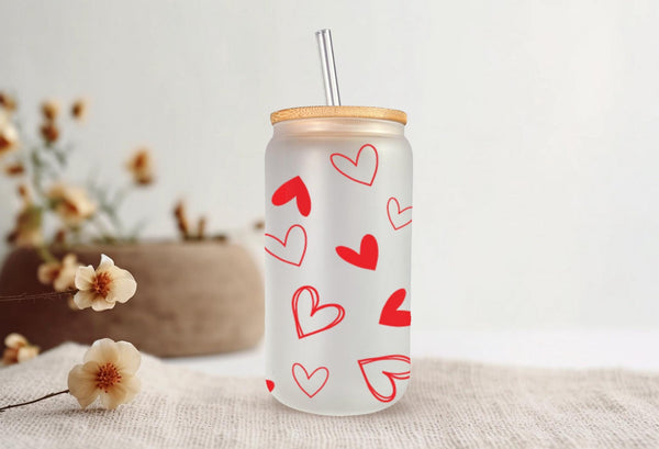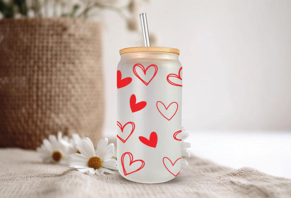 Indulge in your favorite beverage with our Red Hearts Glass Cup! With its intricate red outline hearts and red hearts pattern, this 16oz glass cup is sure to add a touch of love to your drink. Personalize it with clear or frosted design and make every sip even more special. Cheers to love!