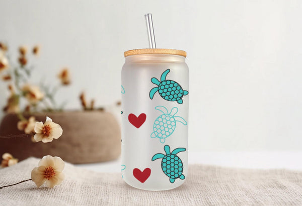 Frosted: A premium, matte finish that gives the cup a "sea glass" vibe and makes the teal and red design pop.