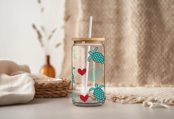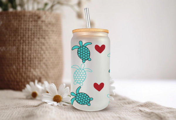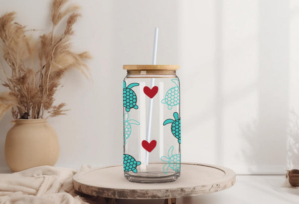 Whether you're dreaming of the beach or just need a hydration companion for your desk, this tumbler is the perfect catch. Featuring a sweet pattern of teal sea turtles (both filled and outline styles) mixed with cute red hearts, it’s a must-have for any turtle lover or ocean enthusiast.