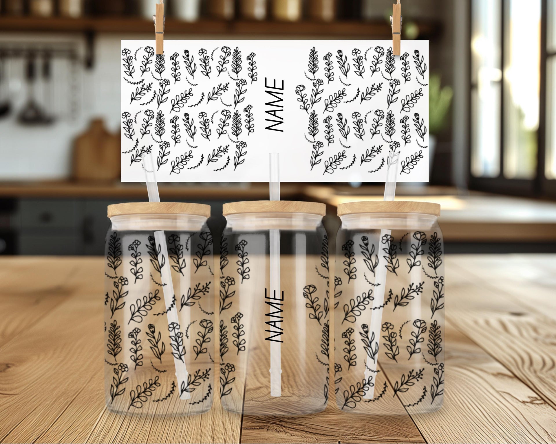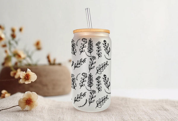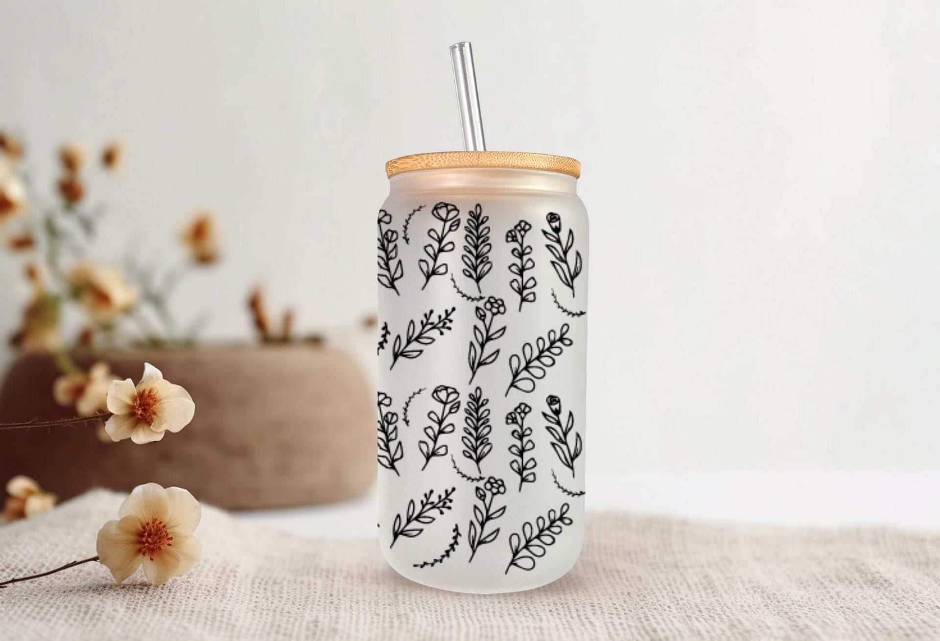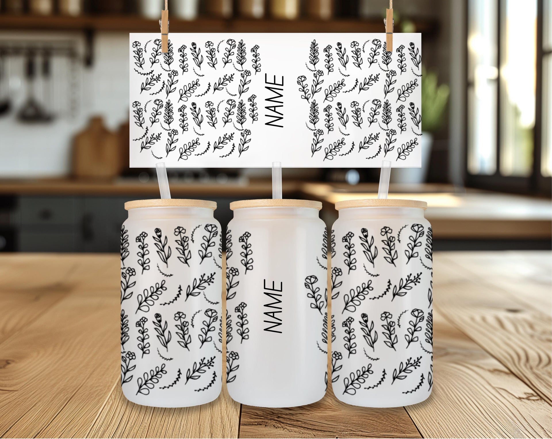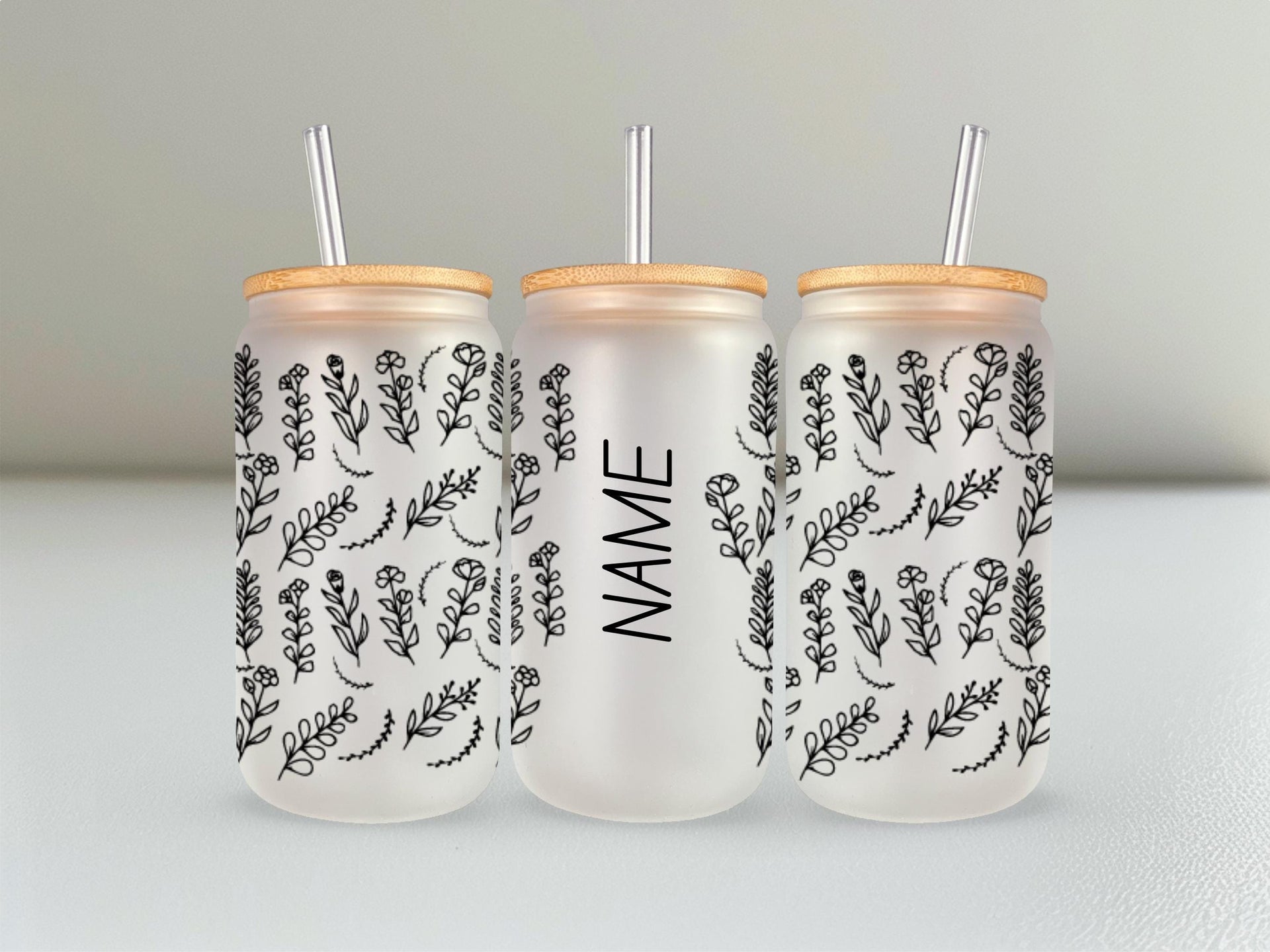 Personalized Wildflower Glass Tumbler, Frosted Floral Iced Coffee Cup