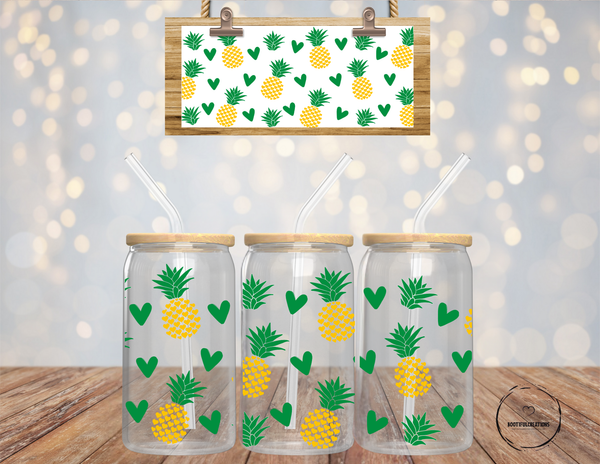 Indulge in a tropical paradise with our Pineapple Glass Cup! Adorned with playful pineapples and green hearts, this 16oz cup is perfect for any drink. Choose between a clear or frosted finish and bring some fun to your sips.