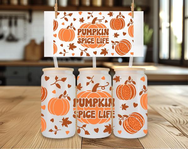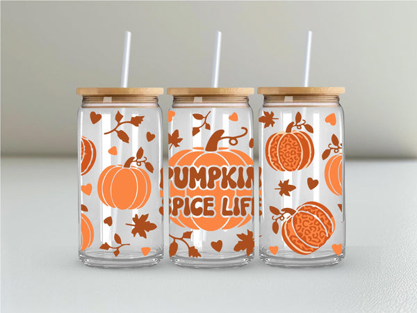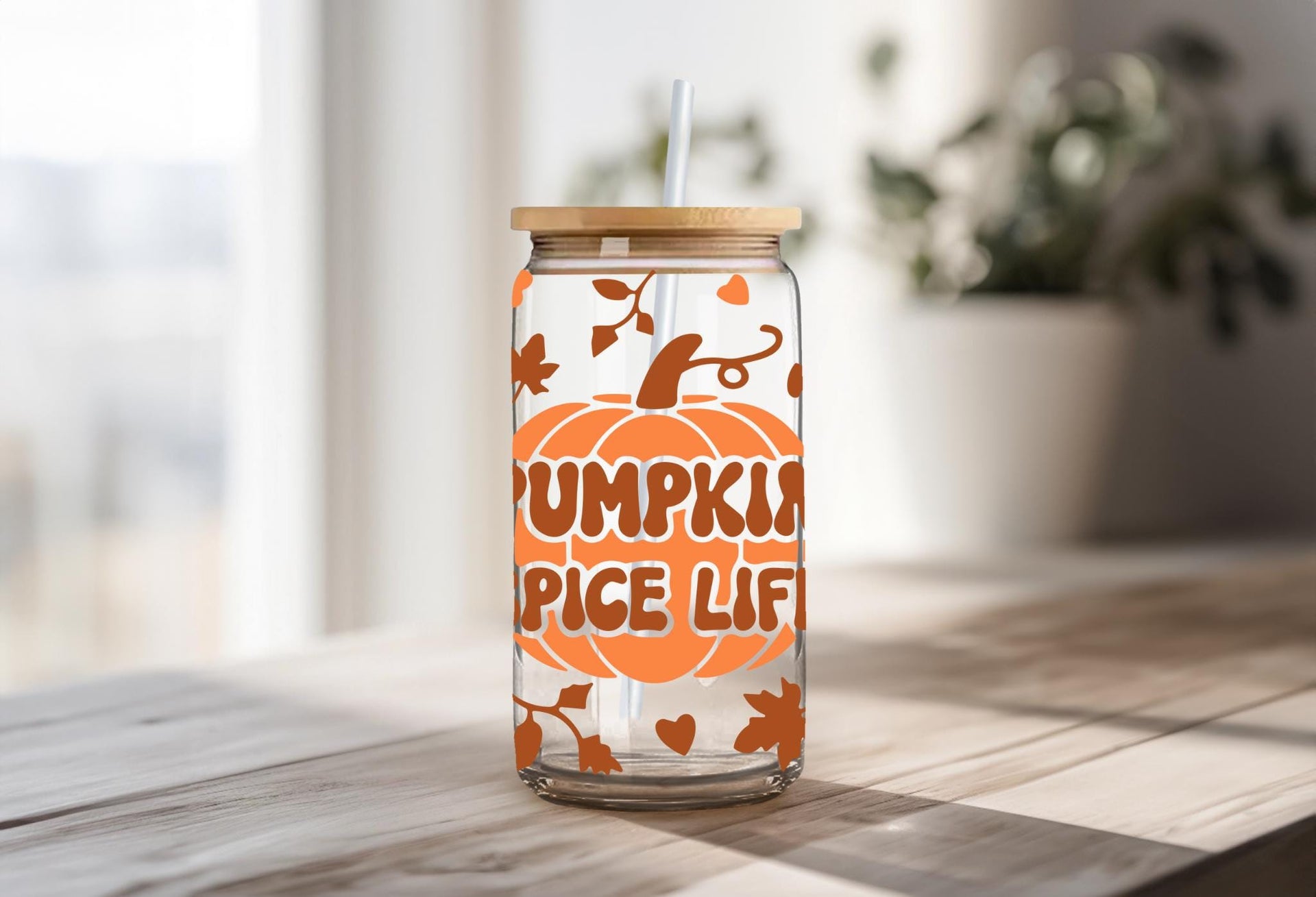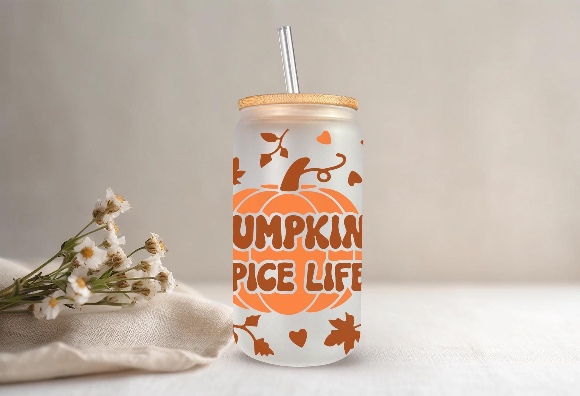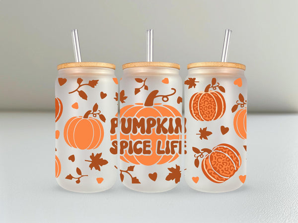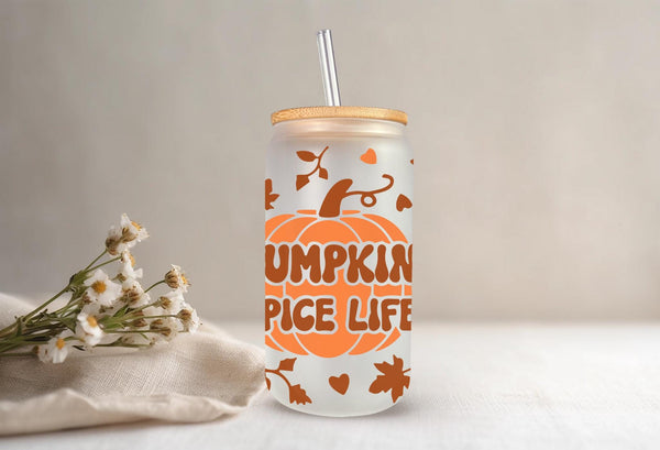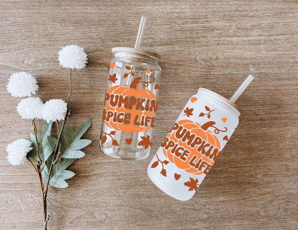 Experience the cozy embrace of Pumpkin Spice Life. Sip from our 16oz glass cup, available in clear or frosted. Indulge in the rich, warm flavors of pumpkin and spice, and let the delicious aroma take you away. Treat yourself to a taste of fall all year round!