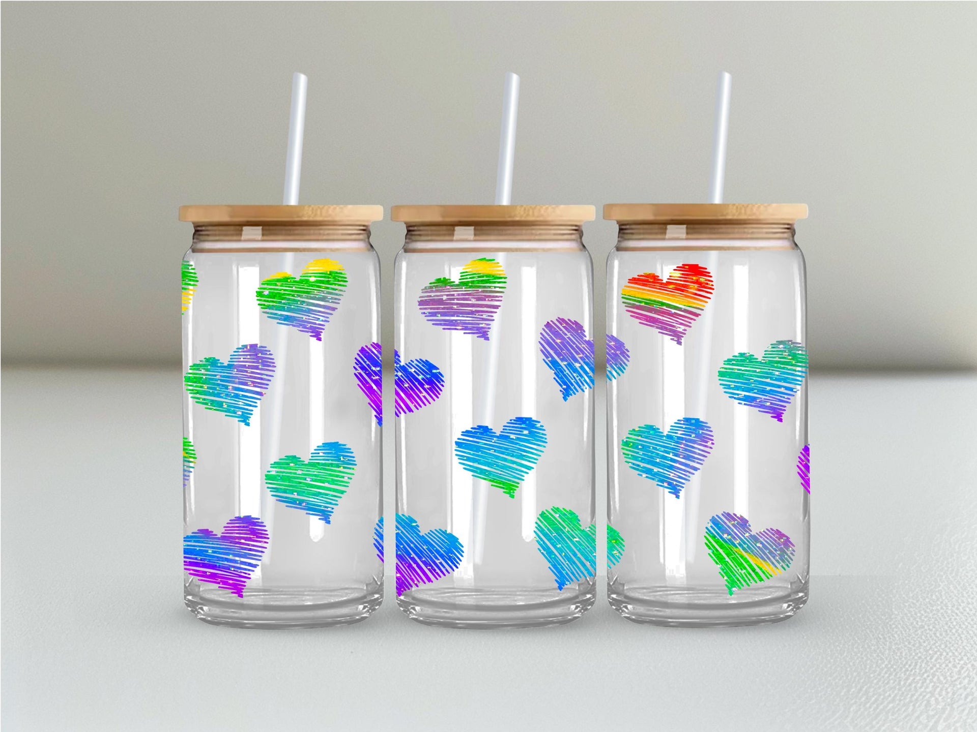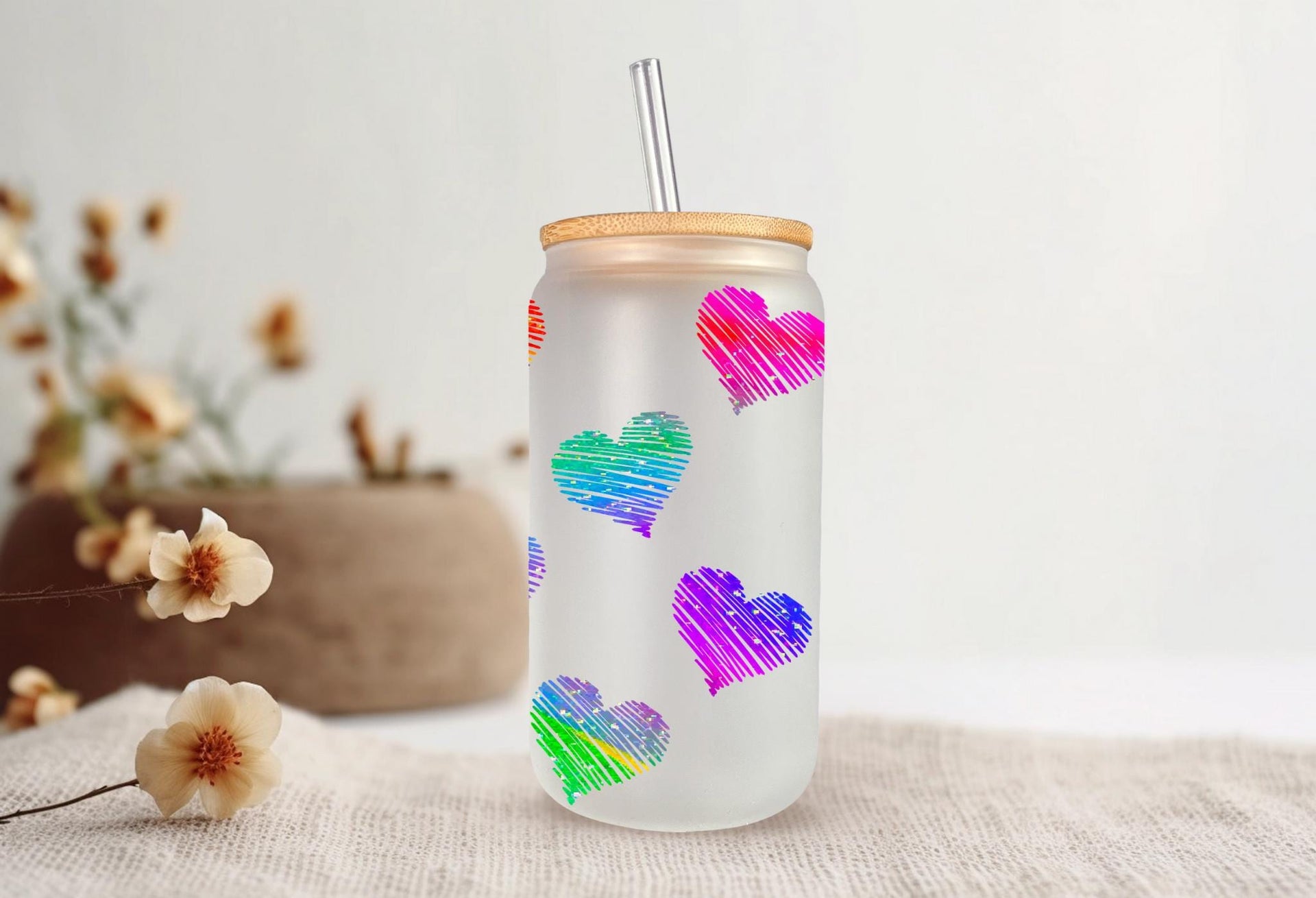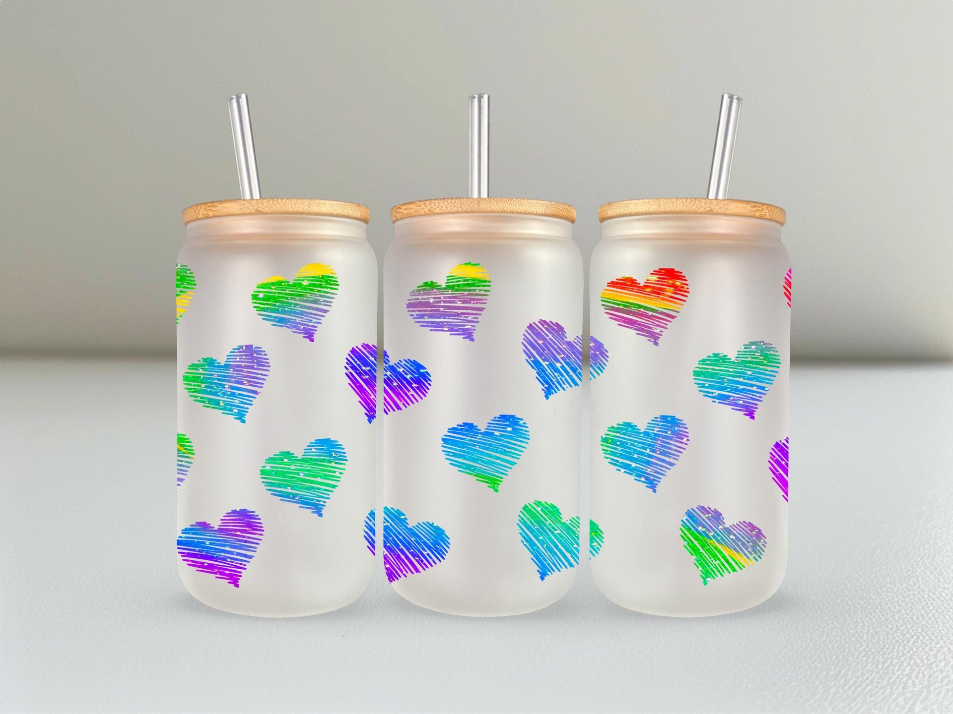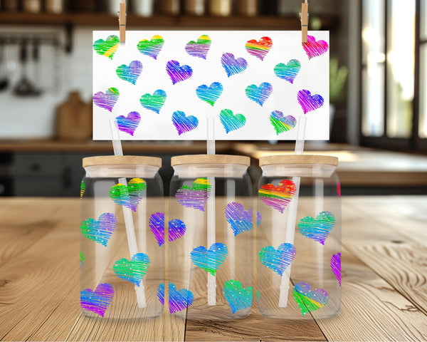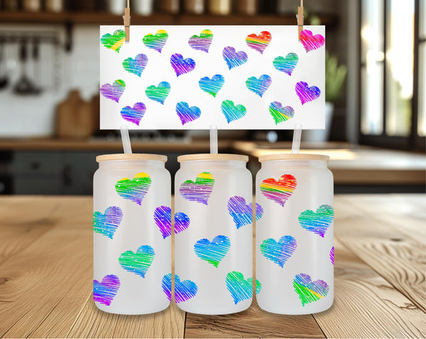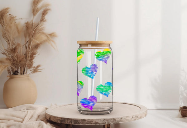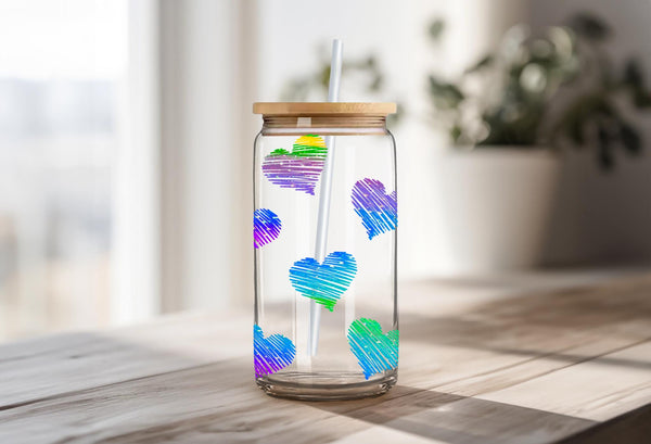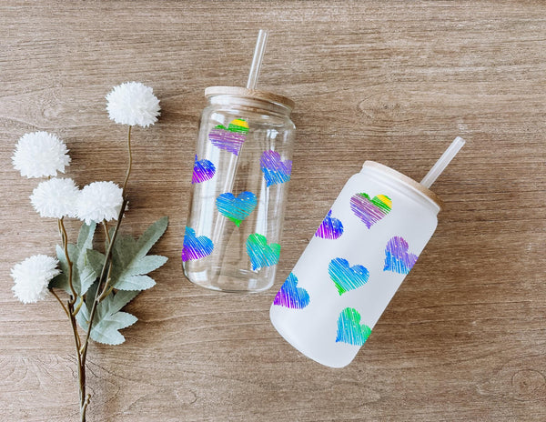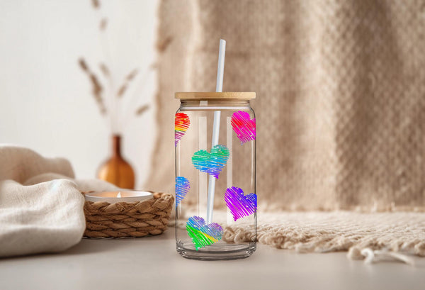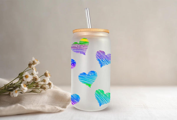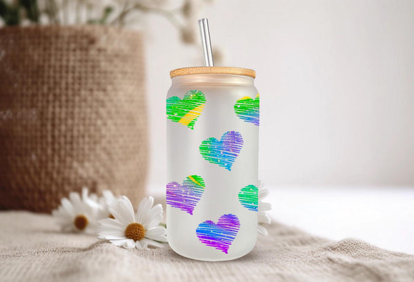 Add some love to your daily routine with our Rainbow Hearts Glass Cup! With a 16oz capacity, this glass cup is perfect for all your favorite drinks. Choose from a clear or frosted design and enjoy the vibrant rainbow hearts that will bring joy to your day. Elevate your beverage experience now!