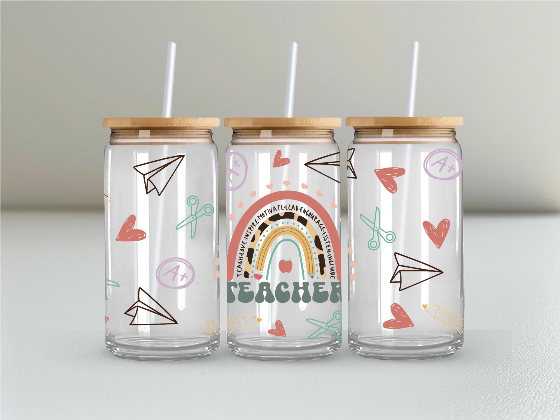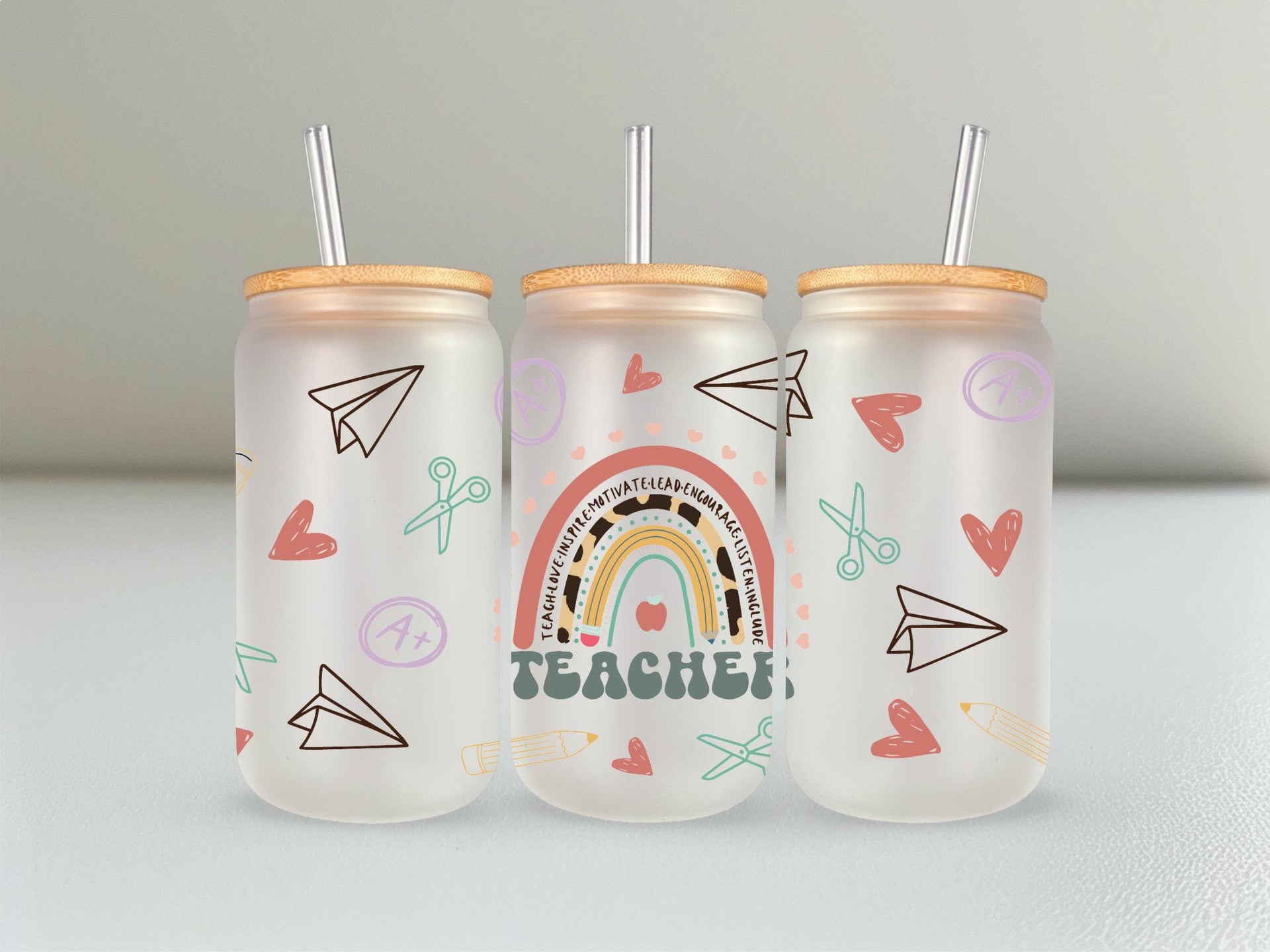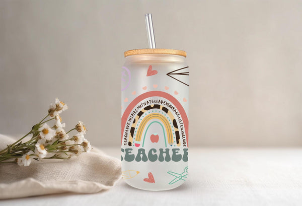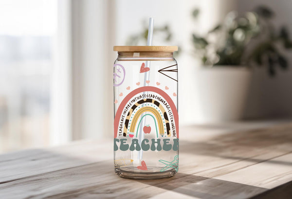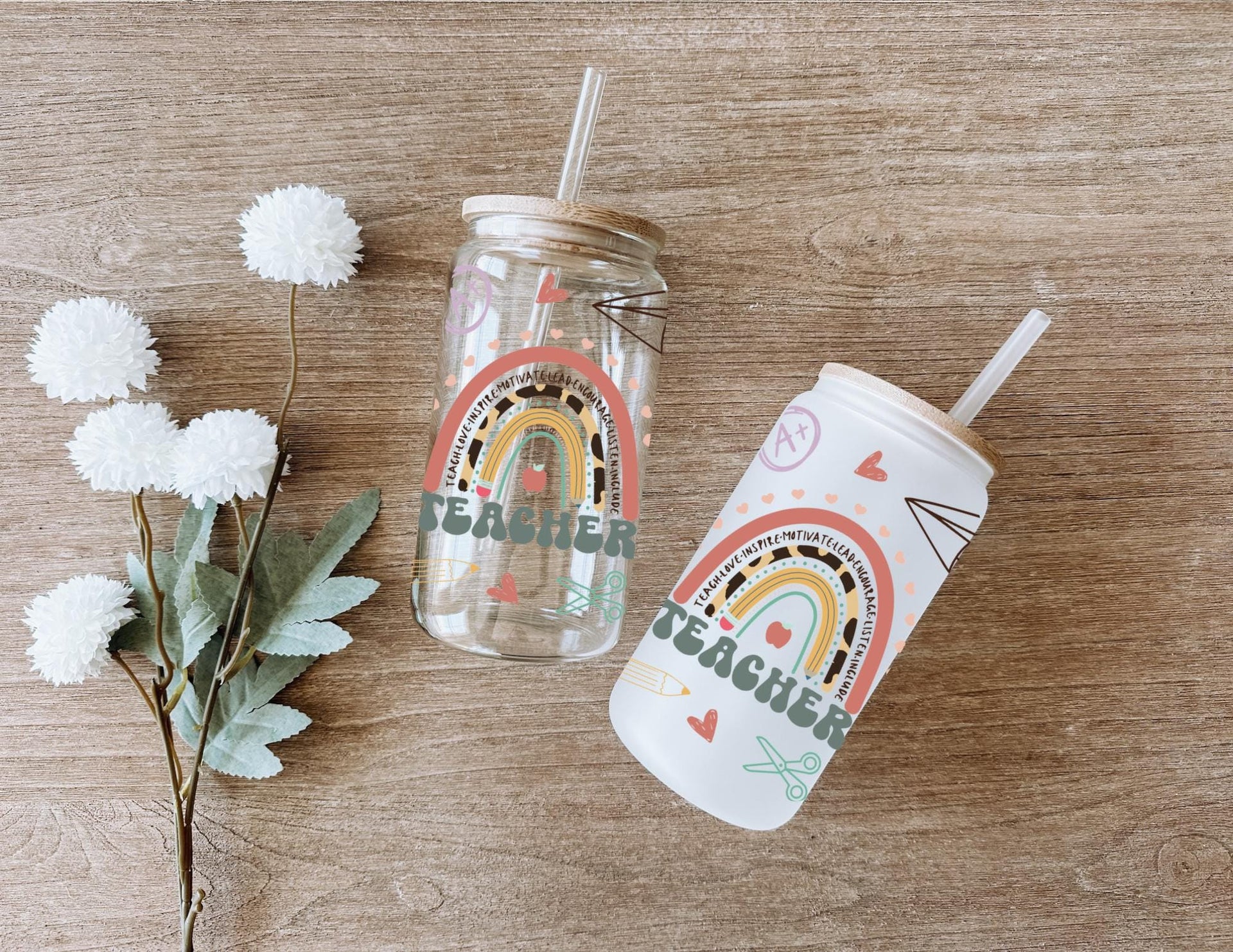 Show off your teacher pride with our Rainbow Teacher Glass Cup! Perfect for any teacher, this 16oz cup features a vibrant rainbow design and comes in clear or frosted. Sip in style while spreading positivity and love in the classroom!