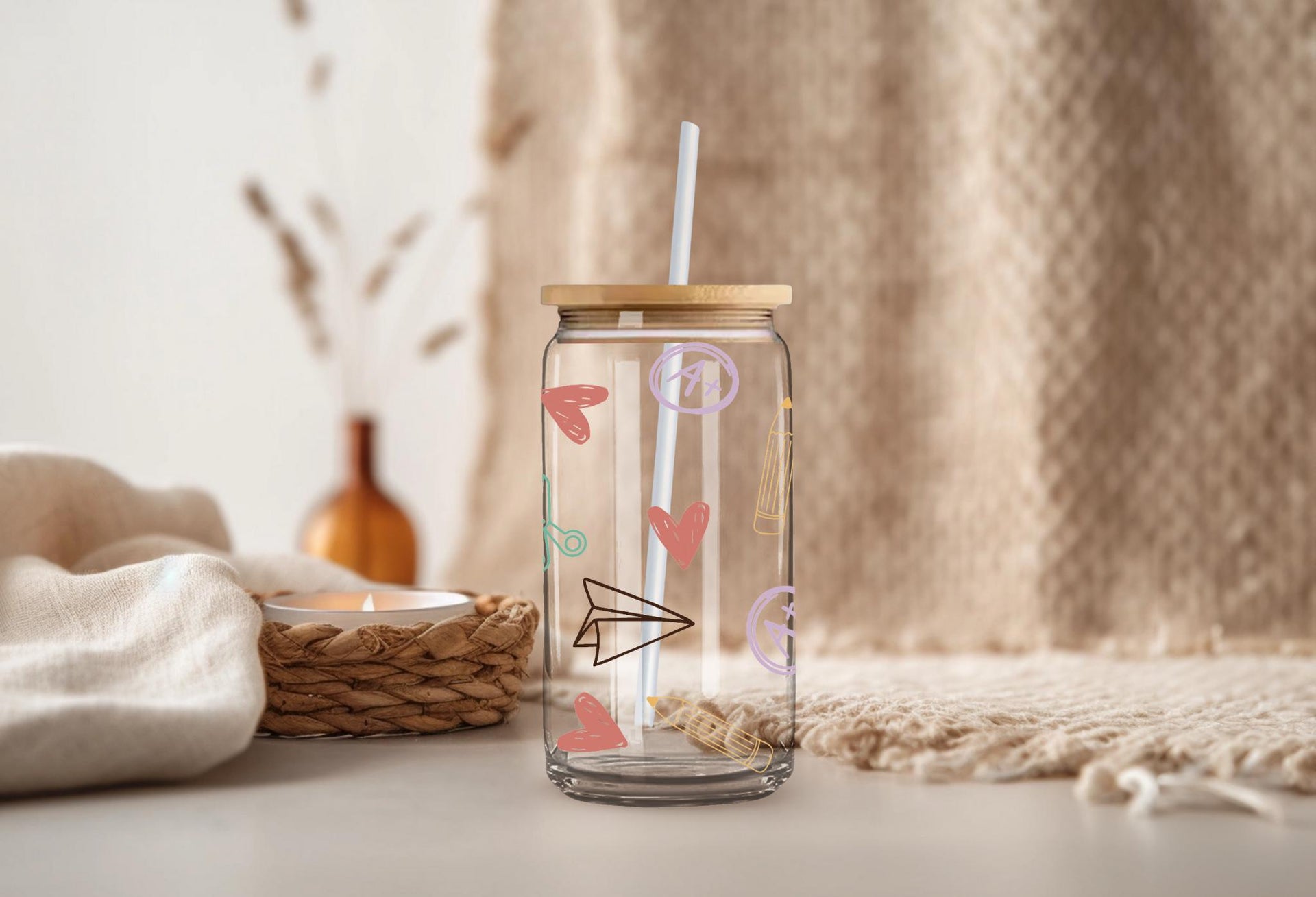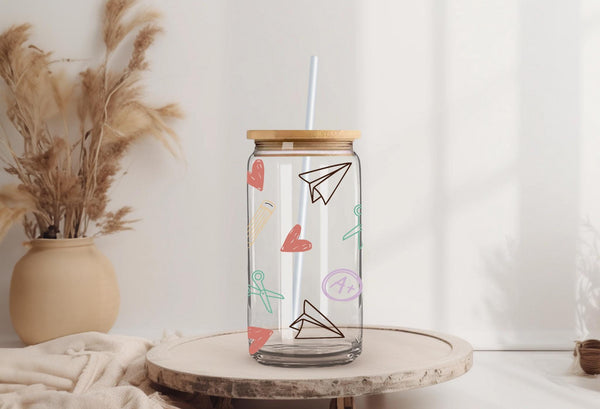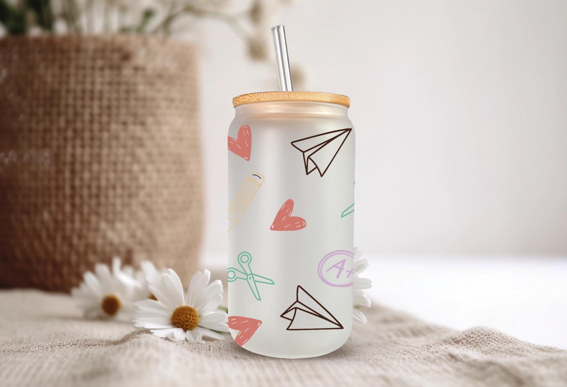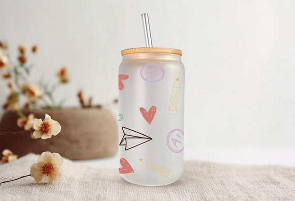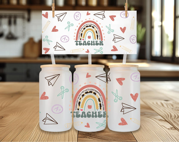 Show off your teacher pride with our Rainbow Teacher Glass Cup! Perfect for any teacher, this 16oz cup features a vibrant rainbow design and comes in clear or frosted. Sip in style while spreading positivity and love in the classroom!
