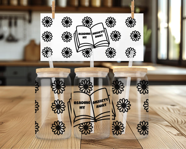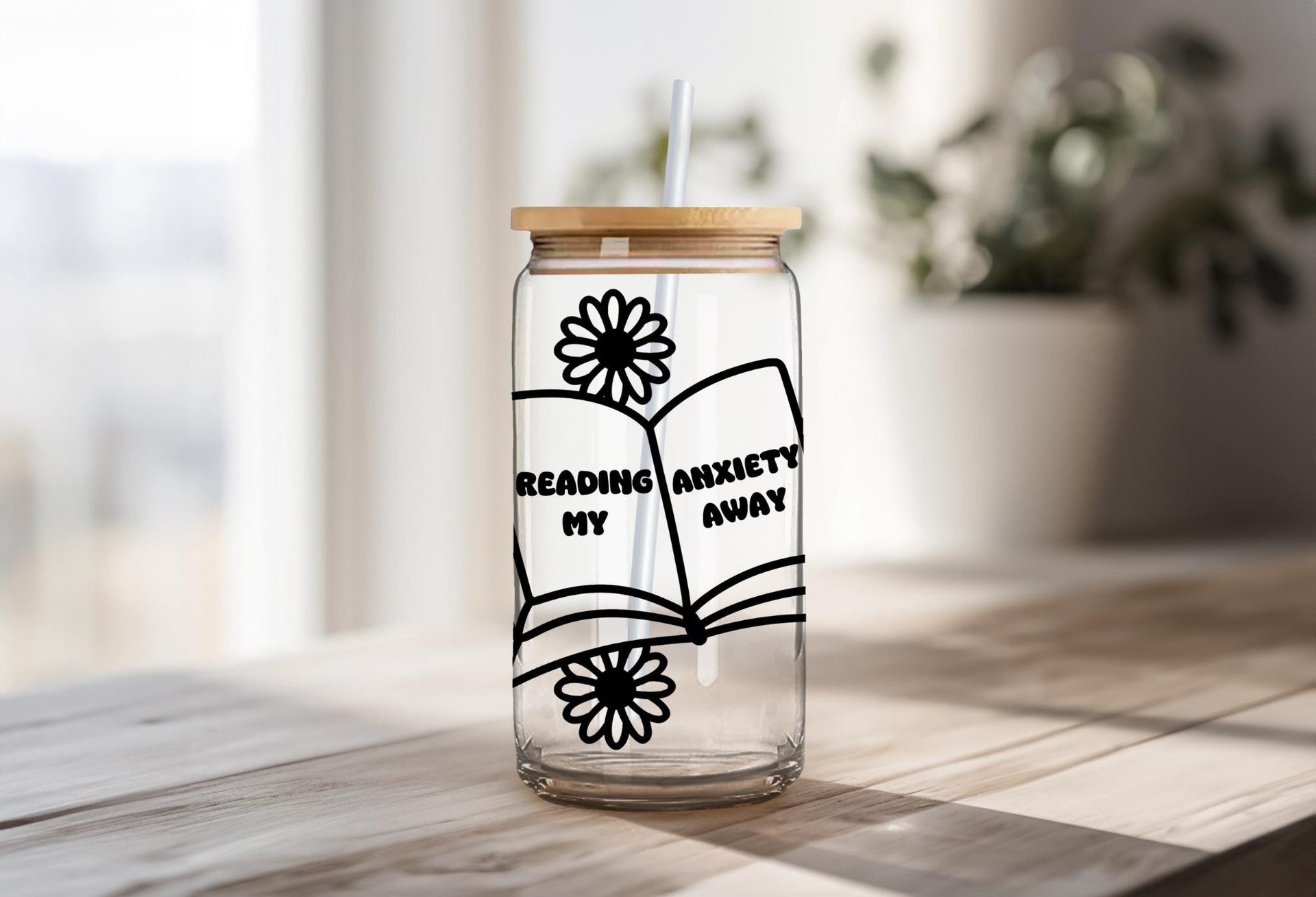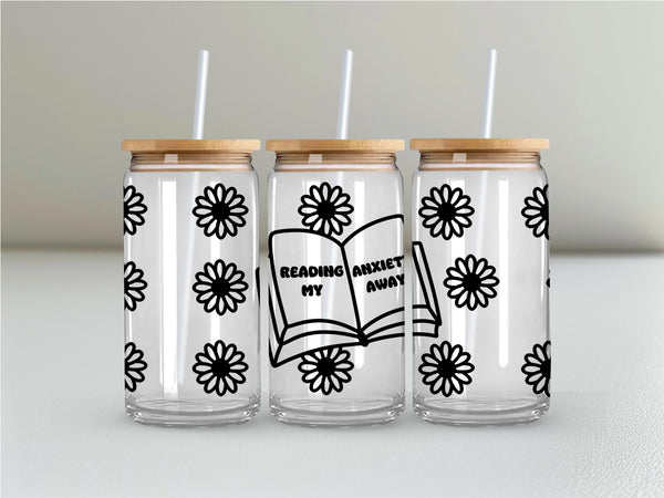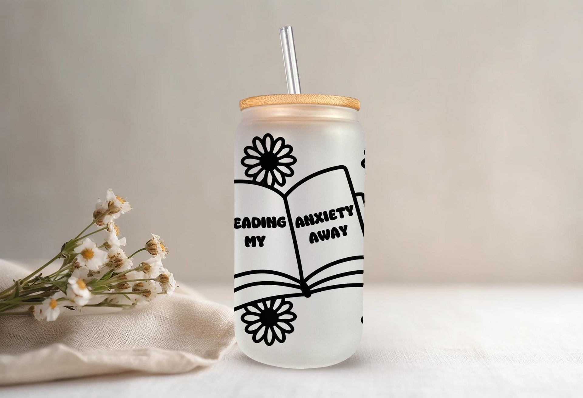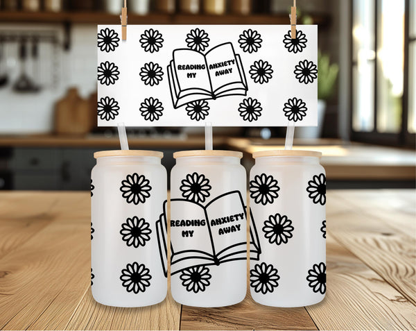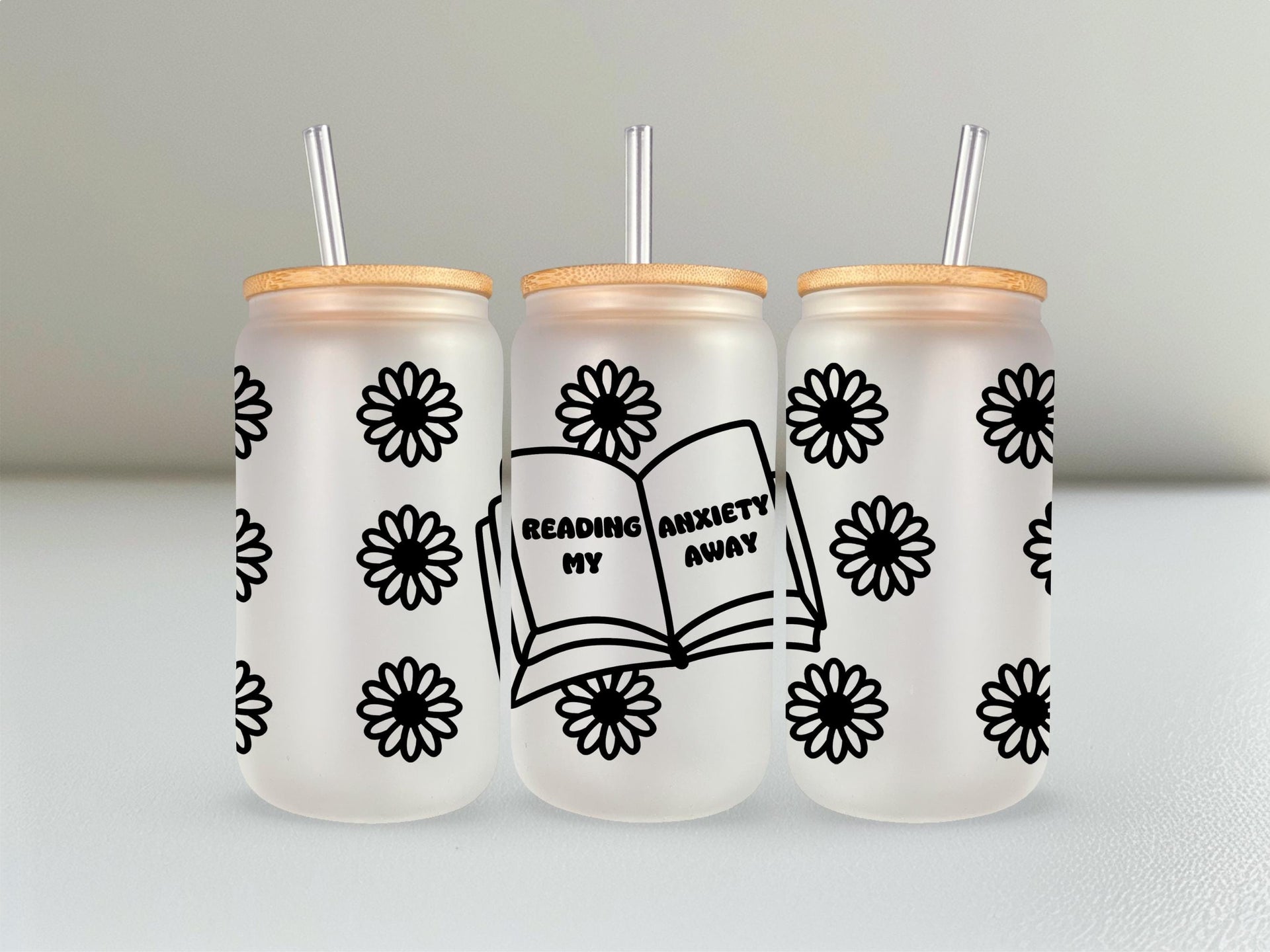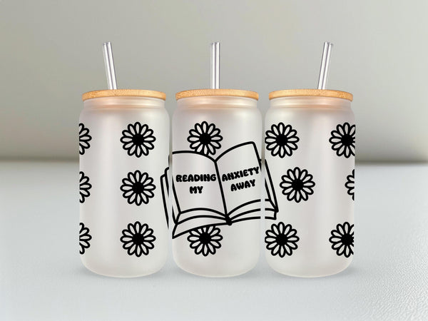 Indulge in self-care with the "Reading My Anxiety Away" Glass Cup. With its beautiful floral design, this 16oz cup comes in clear or frosted. Relax and unwind while sipping your favorite drink, and let the words on the cup inspire you to read your worries away.
