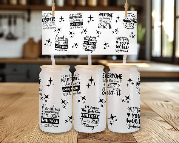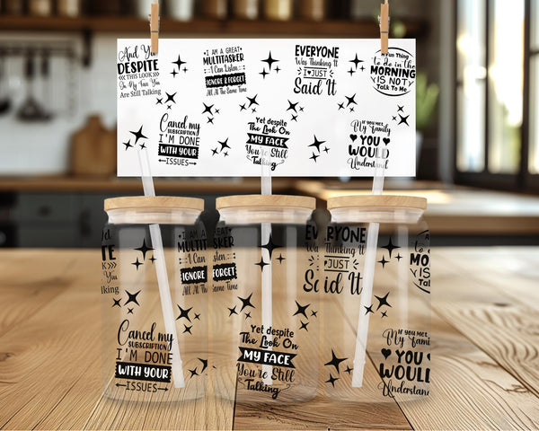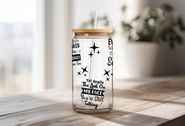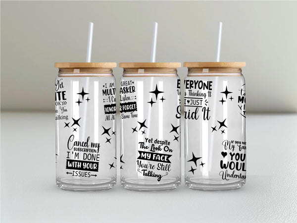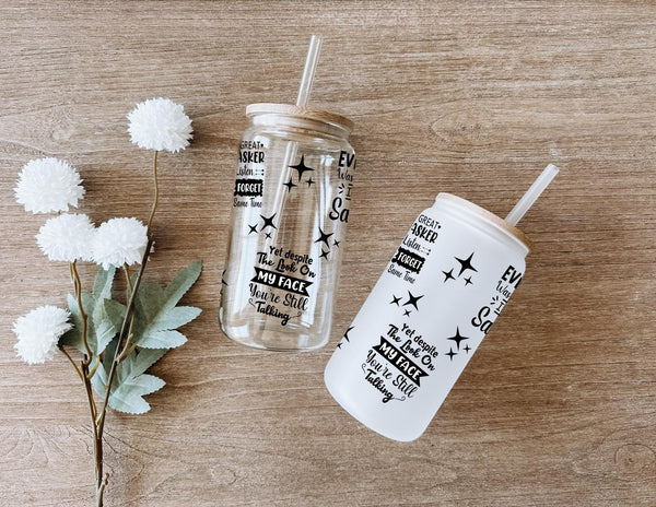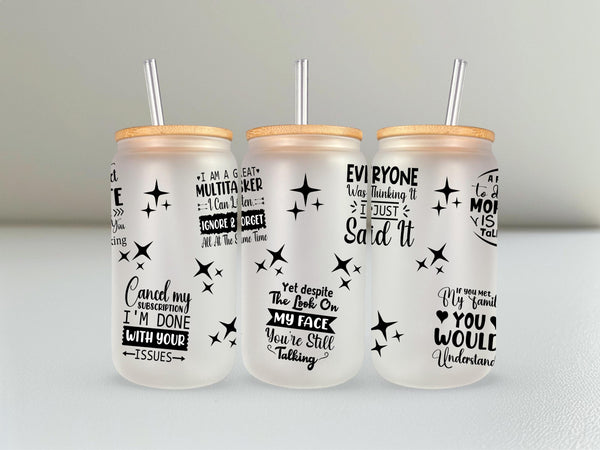 Indulge in your witty side with our Sarcastic Sayings Glass Cup! With 16oz of liquid capacity, this clear or frosted cup will surely spark conversation and bring laughs to any gathering. Perfect for sipping on your favorite drink and expressing your humorous personality. Get yours now!