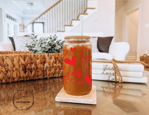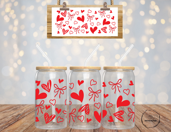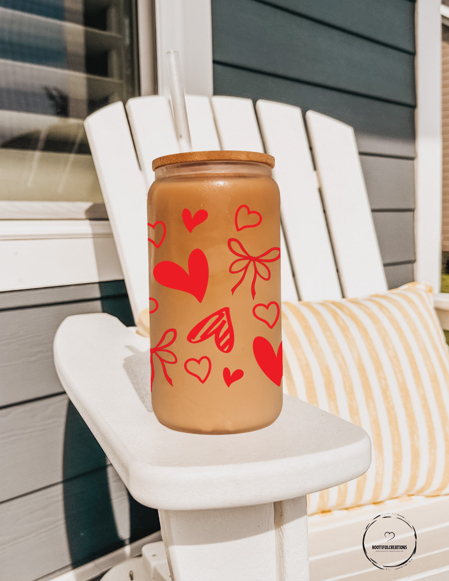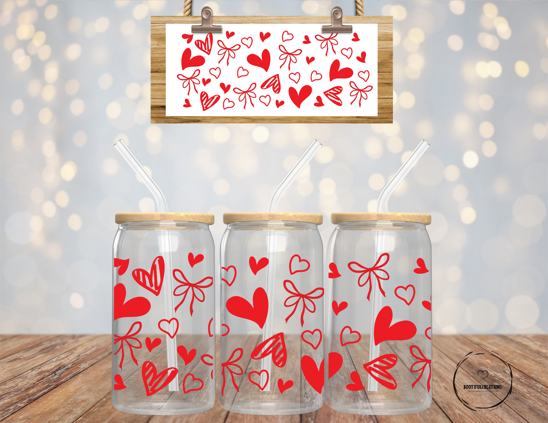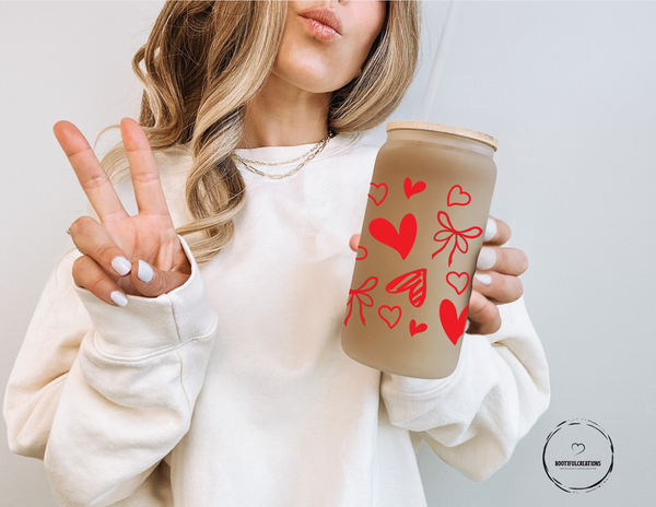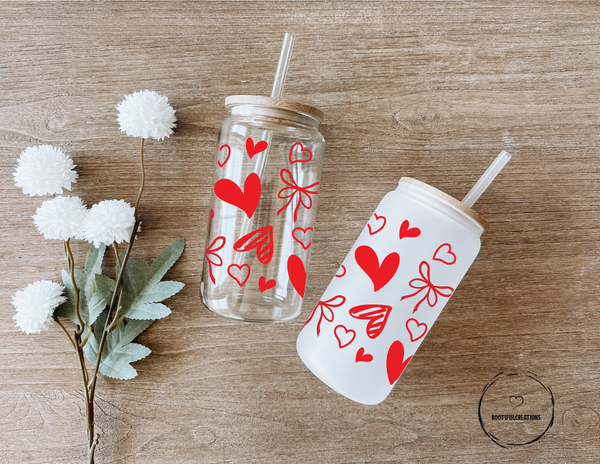 Sip in style with our Scribble Hearts and Bows Glass Cup! This gorgeous 16oz glass cup features a charming heart and bow pattern, perfect for adding some love to your daily drink. Available in both clear and frosted options, it's a must-have for any drinkware collection.