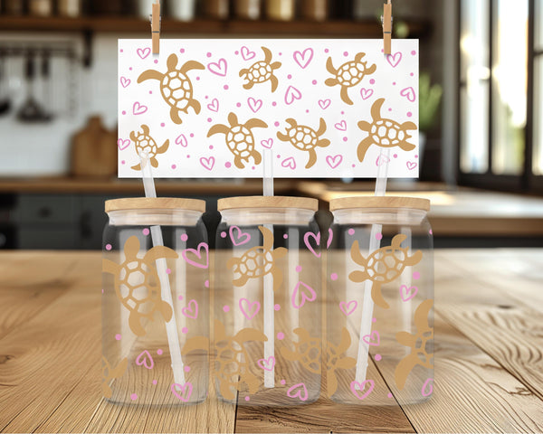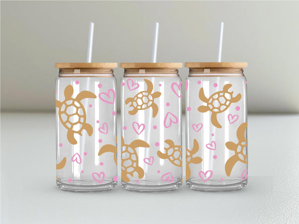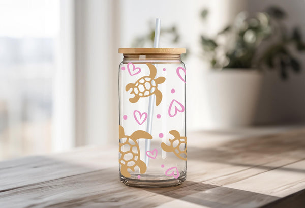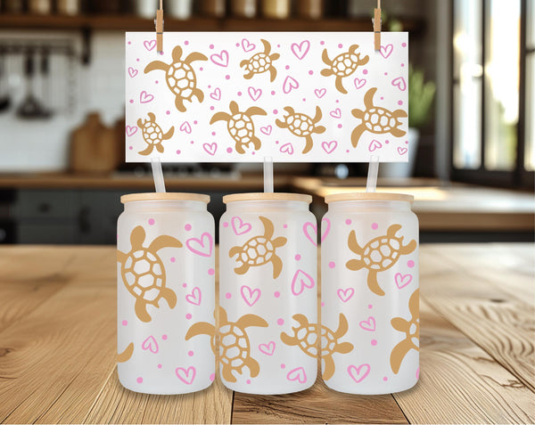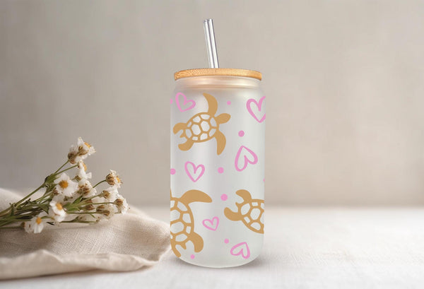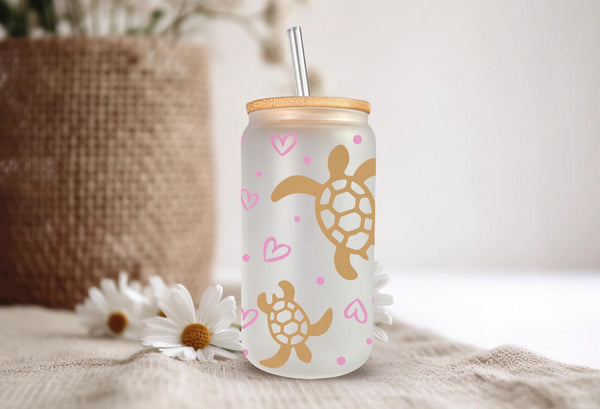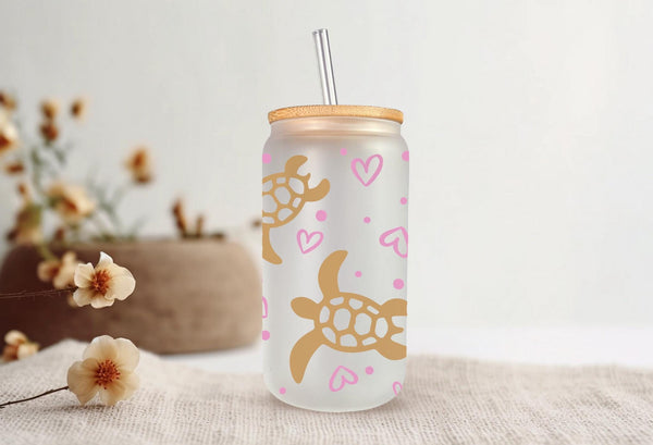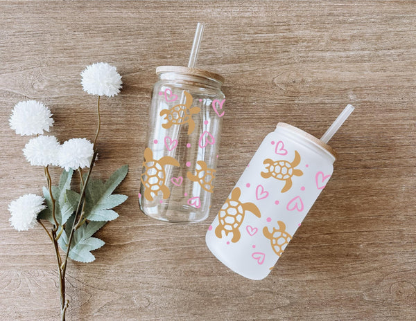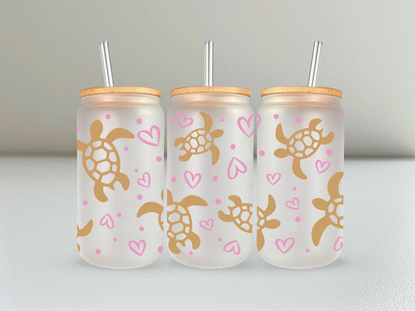 Introducing the Turtle Glass Cup! Adorned with delicate gold turtles and pink hearts, this 16oz glass cup is both stylish and functional. Choose between a clear or frosted finish to suit your taste. Sip your favorite beverage in style and add a touch of whimsy to your day.