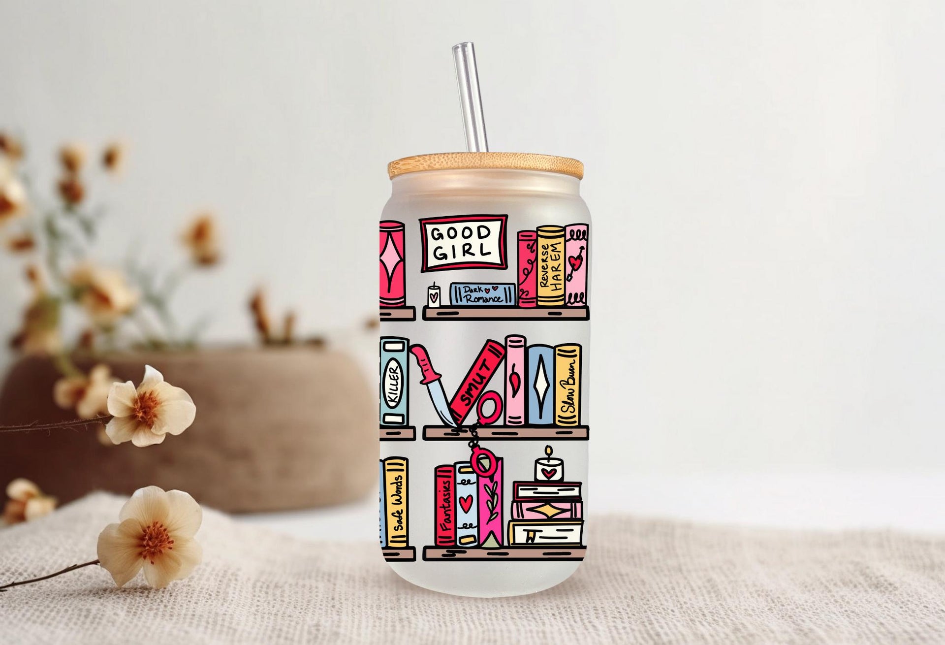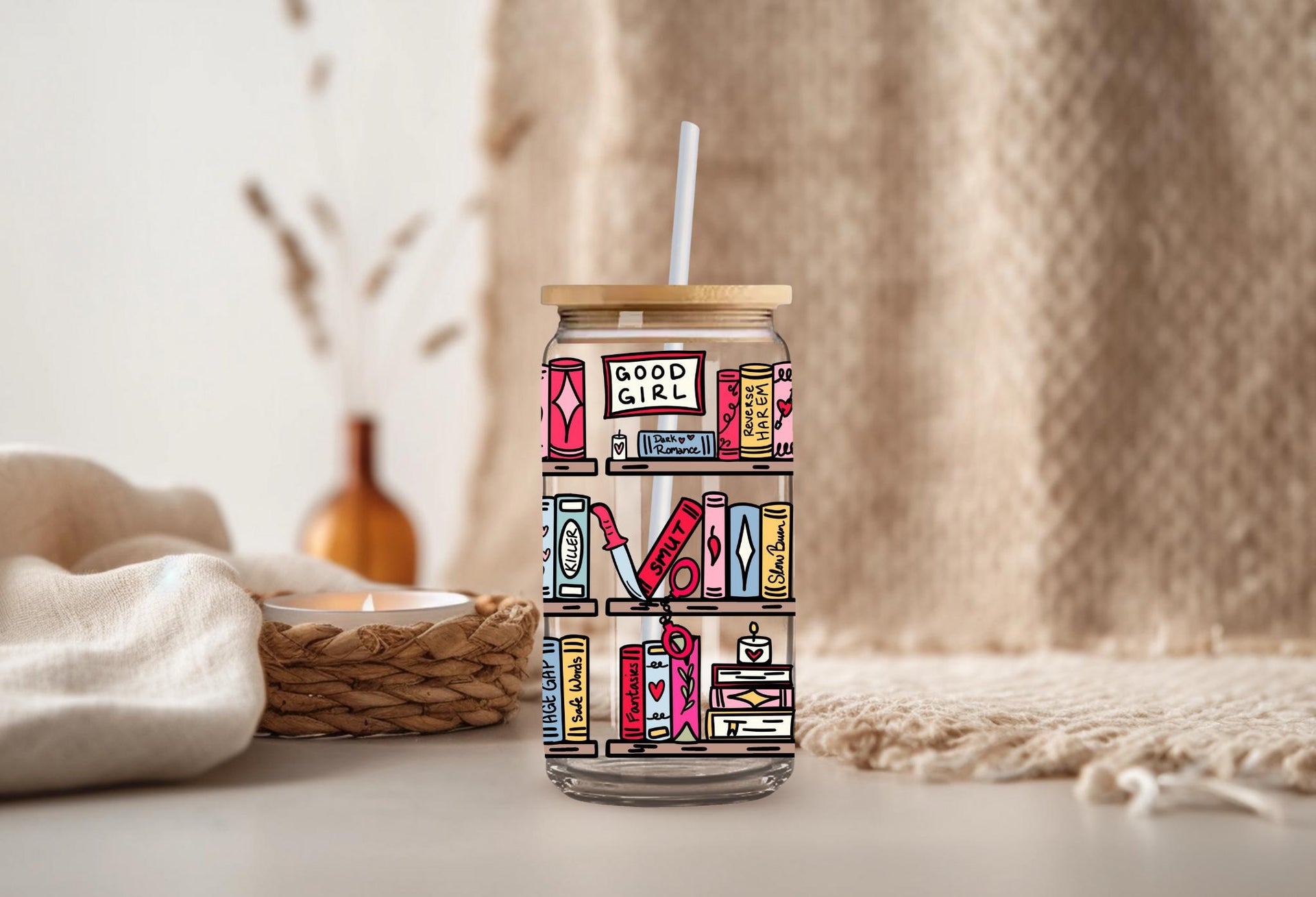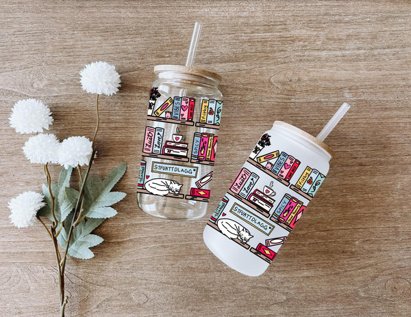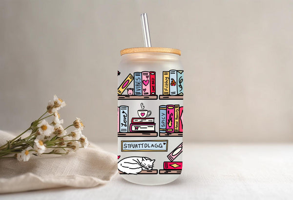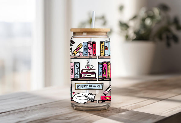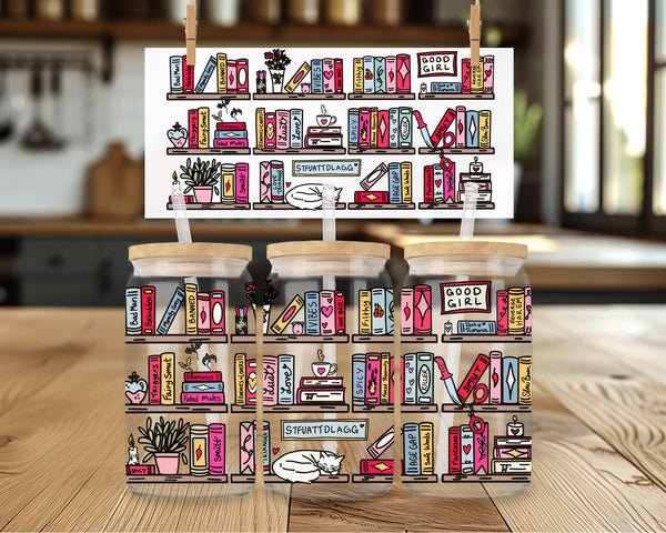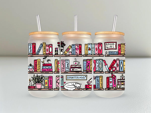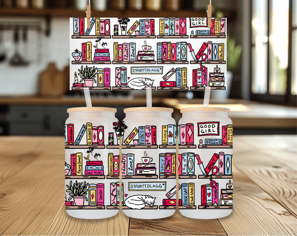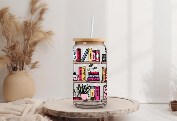 Step up your reading game with this hilariously detailed, can-shaped glass tumbler! This full-wrap design features a vibrant, colorful bookshelf absolutely stacked with books and items that any spicy romance reader will immediately recognize and appreciate.