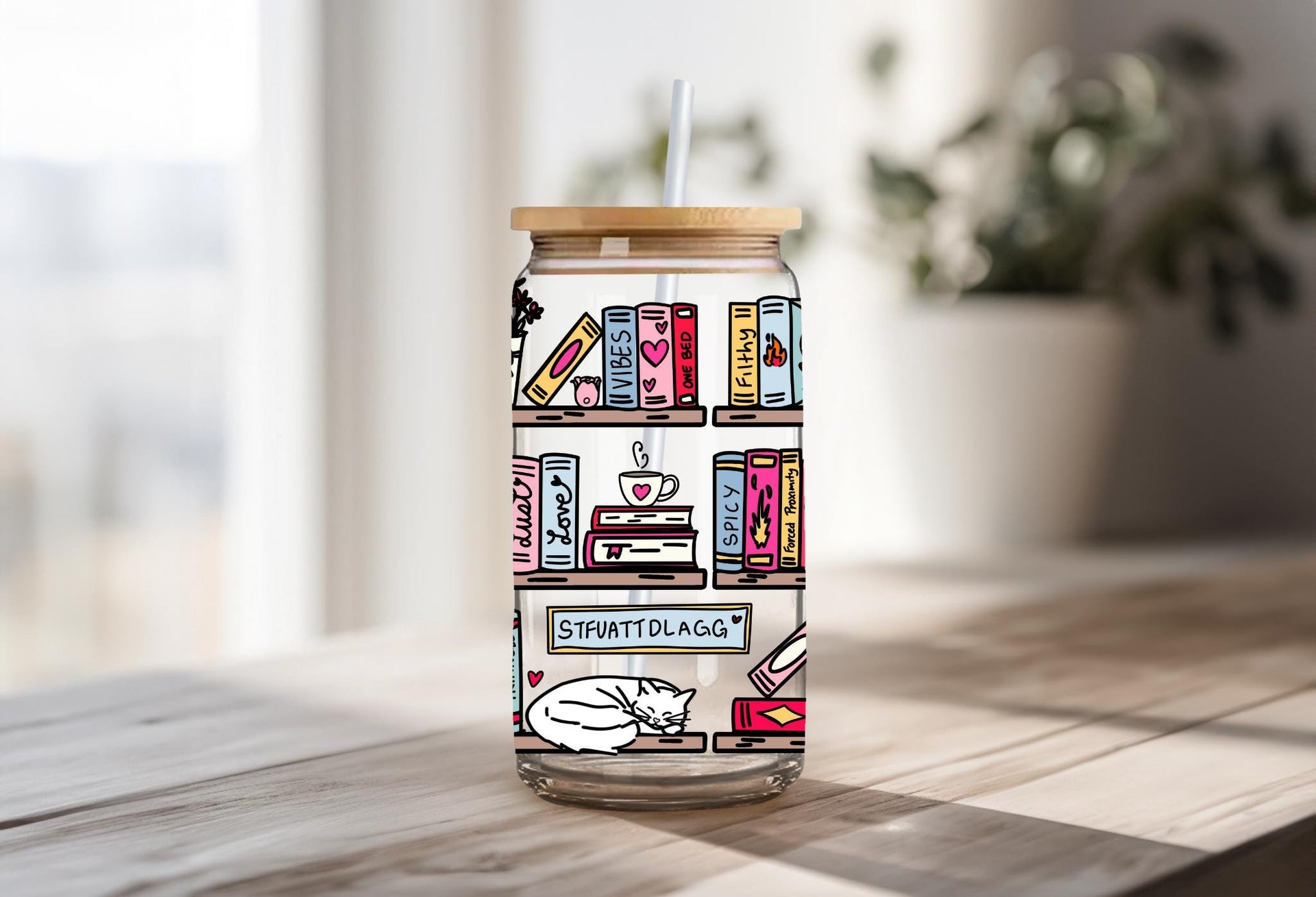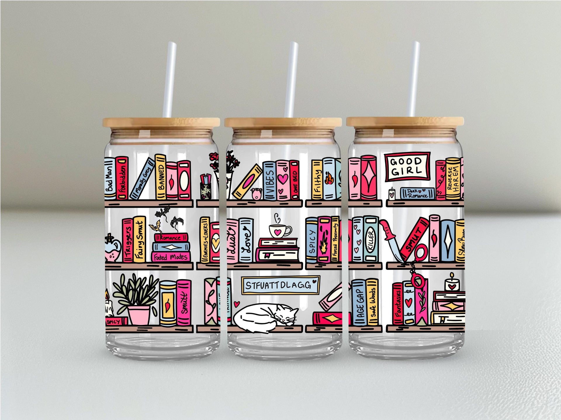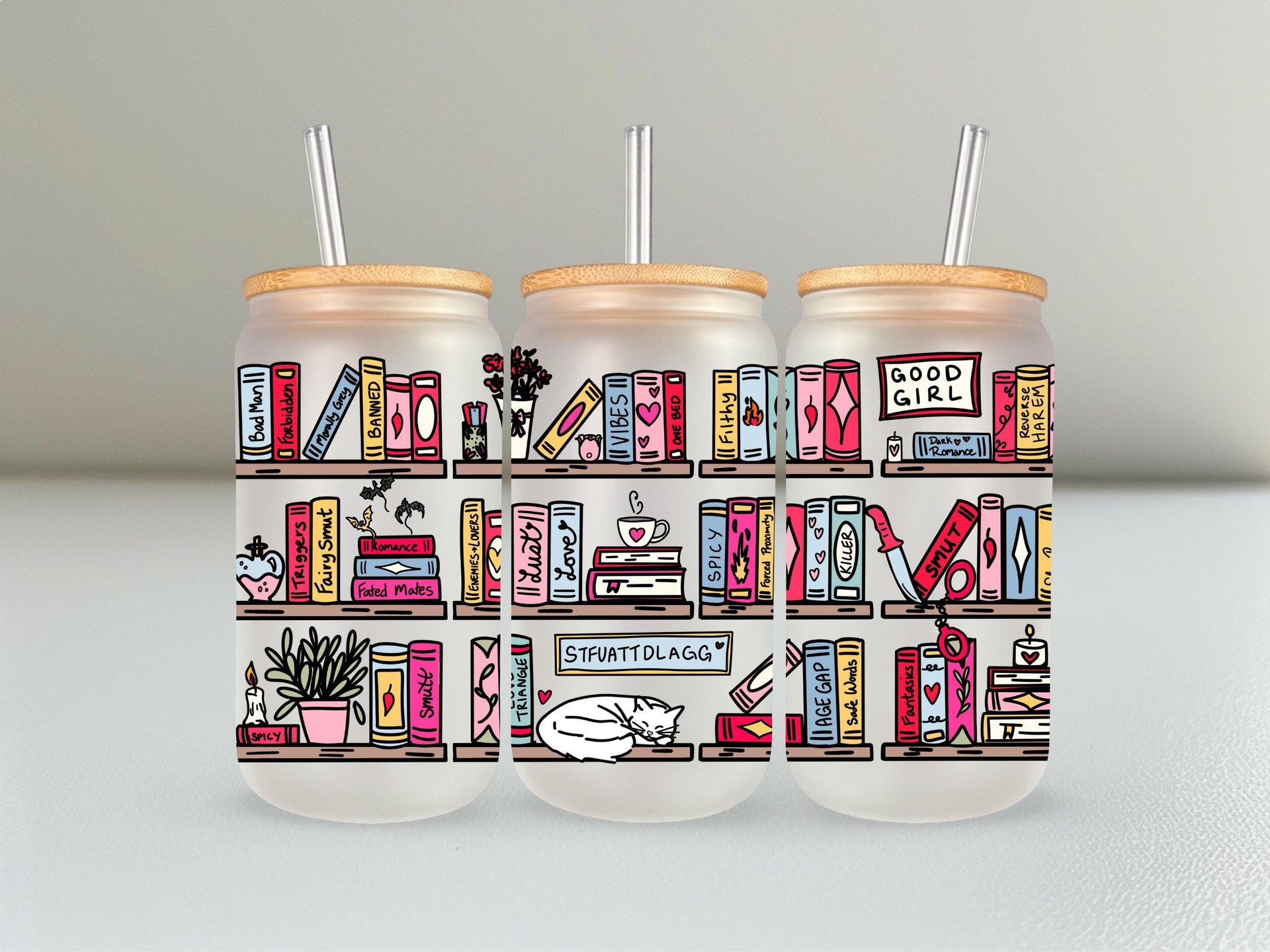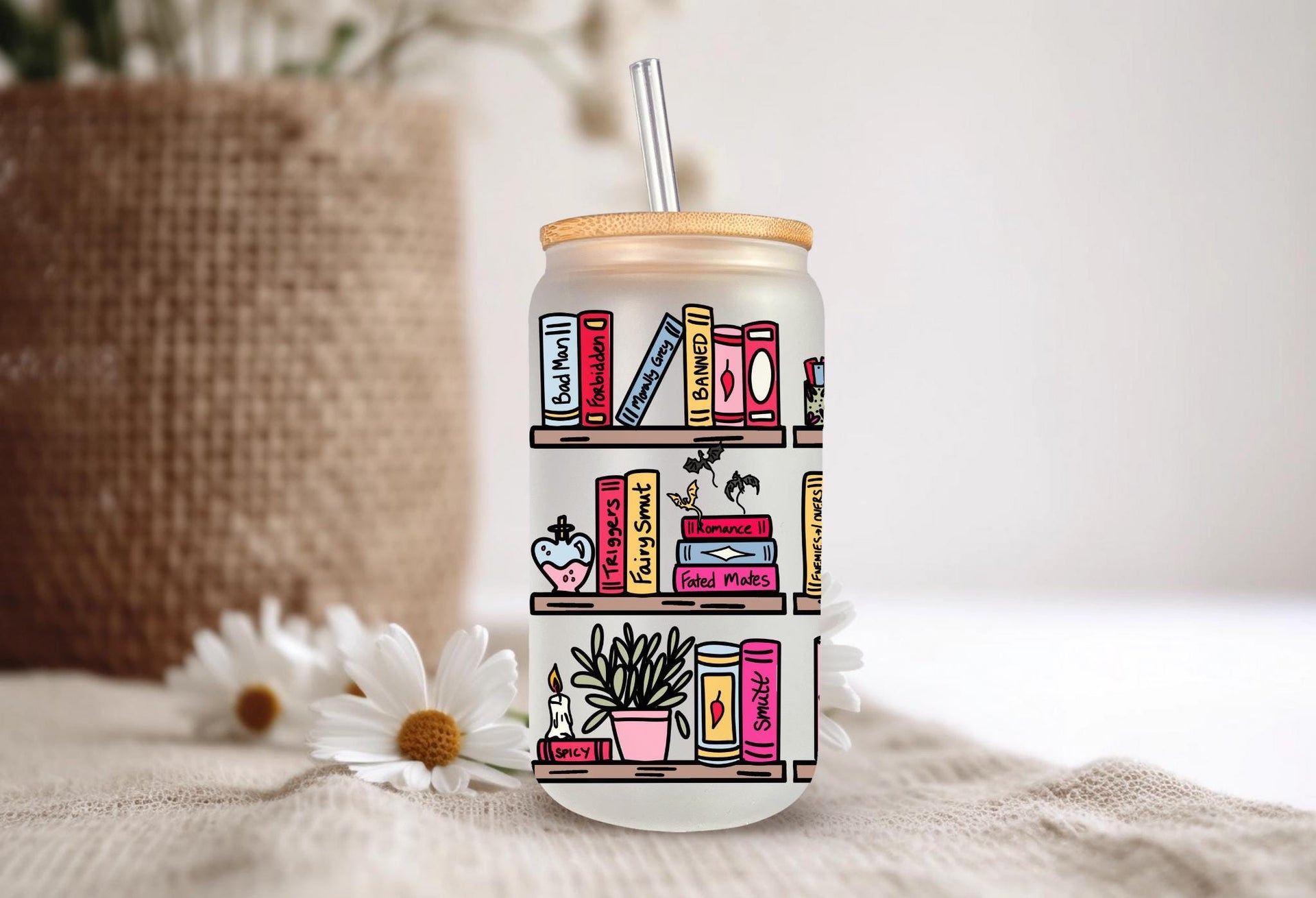 Step up your reading game with this hilariously detailed, can-shaped glass tumbler! This full-wrap design features a vibrant, colorful bookshelf absolutely stacked with books and items that any spicy romance reader will immediately recognize and appreciate.