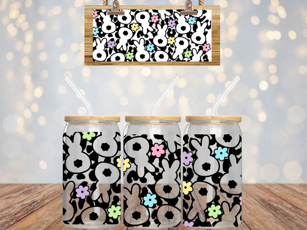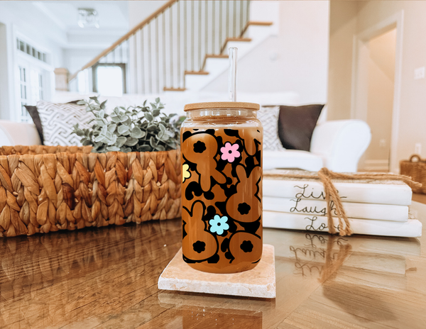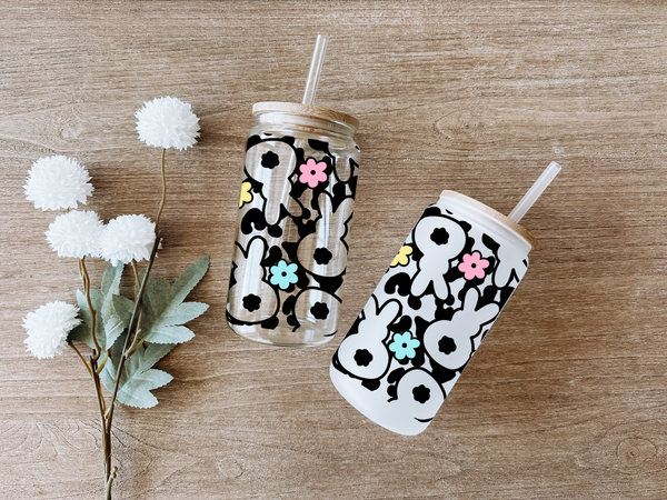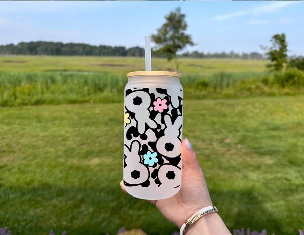 Embrace the joy of spring with our adorable 16oz glass can tumbler! This charming tumbler features a delightful pattern of playful bunnies and pastel flowers, perfect for adding a touch of Easter cheer to your day. The clear glass design showcases the whimsical pattern beautifully, while the included straw and bamboo lid make it ideal for your favorite iced drinks.