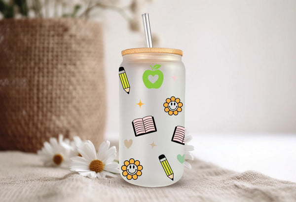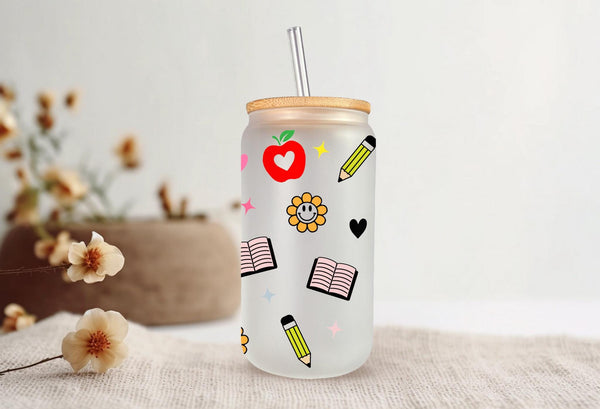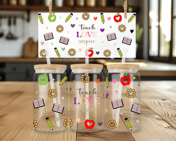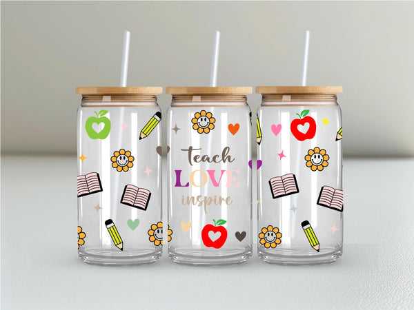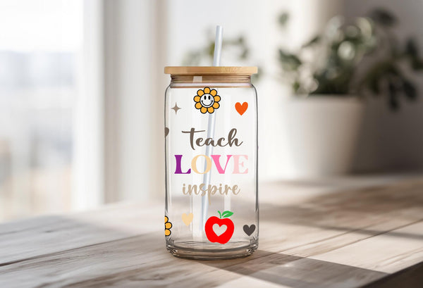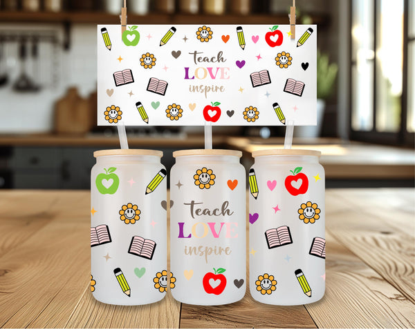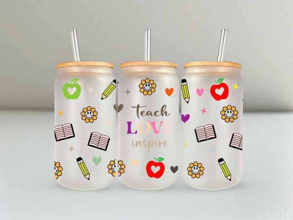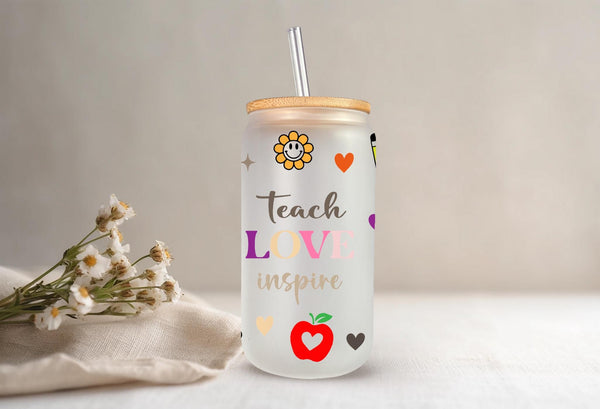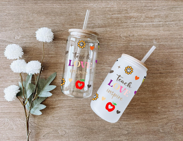 Spread love and inspiration with our "Teach Love Inspire" glass cup. This 16oz cup comes in both clear and frosted options. Perfect for enjoying your favorite beverage while spreading positivity and motivation. Let this cup be a daily reminder to teach, love, and inspire those around you.