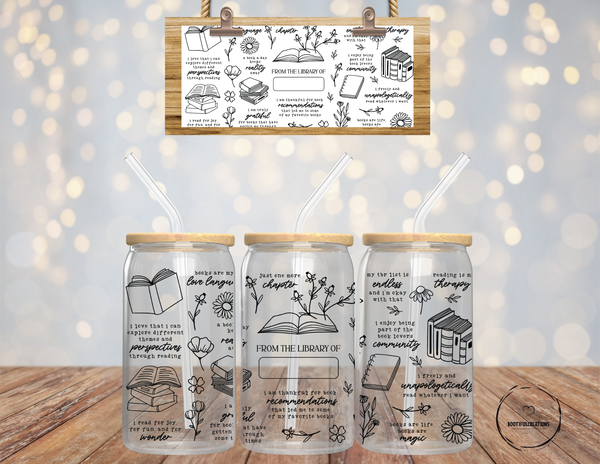 Experience the joy of reading with our From the Library of Glass Cup! Personalized with book lover quotes and "From the Library of" message, this 16oz cup is perfect for your favorite hot or cold beverages. Choose from clear or frosted glass for a unique touch.