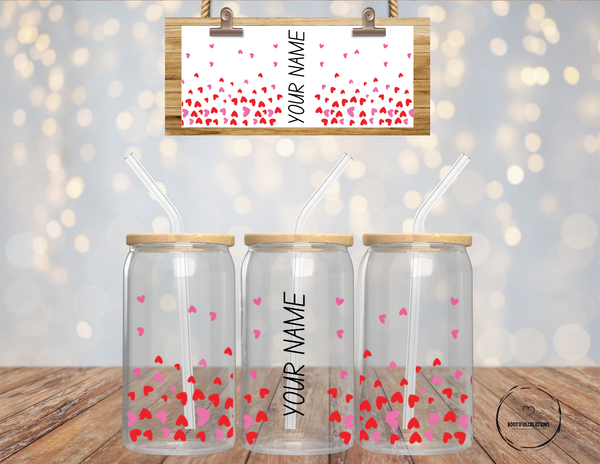 Embrace your loved one with the Lots of Hearts Glass Cup! This personalized 16oz cup is available in clear or frosted glass, adorned with a charming hearts design. Enjoy every sip and feel the love with this unique and thoughtful gift option.