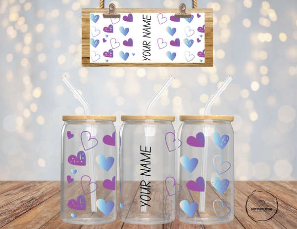 Add a touch of personality to your drinkware collection with our Purple Hearts Glass Cup. This 16oz cup features a unique purple hearts design that can be personalized and is available in both clear and frosted options. Enjoy your favorite beverages in style!
