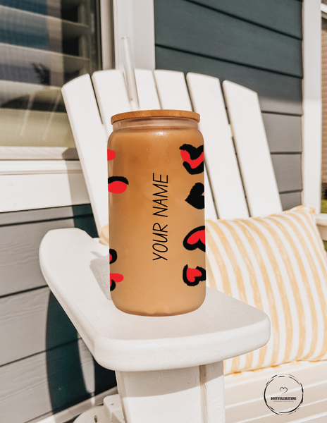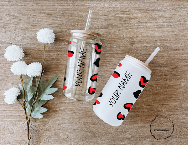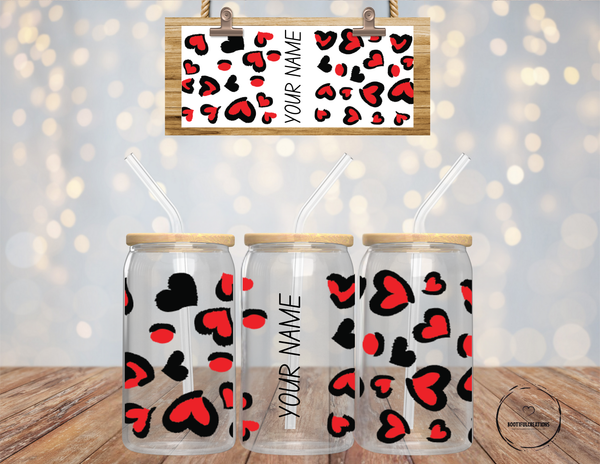 Add some love to your morning routine with our Red Hearts Glass Cup! Designed with vibrant red hearts with a sleek black outline, this 16oz glass cup can be personalized to make it uniquely yours. Choose between a clear or frosted finish and start your day off with a touch of affection.
