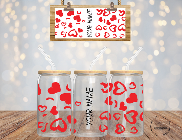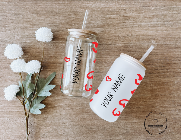 Add a touch of love to your morning coffee with our Traditional Hearts Glass Cup! Featuring a red outline and filled in hearts, this personalized 16oz cup is perfect for any beverage. Choose between a clear or frosted finish and spread the love with every sip. Order now and add a dash of romance to your daily routine!