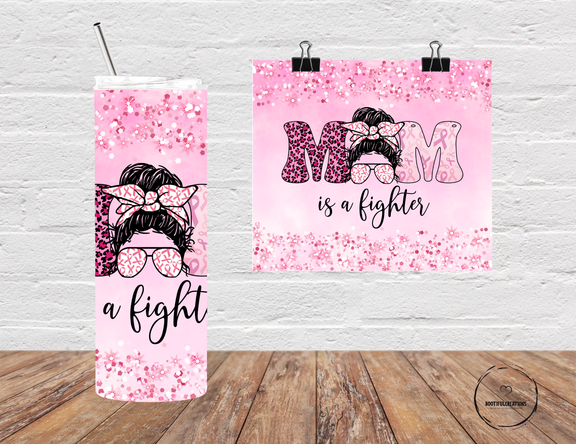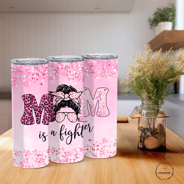 Stay strong and hydrated with the A Fighter Tumbler! Featuring a "Mom is A Fighter" design and pink cancer ribbons, this tumbler keeps drinks hot for up to 6 hours and cold for up to 24 hours. Personalize it with a name for a unique touch. A perfect gift for the strong and courageous.