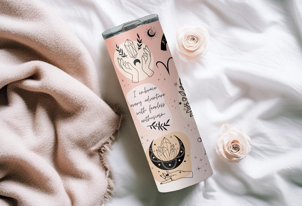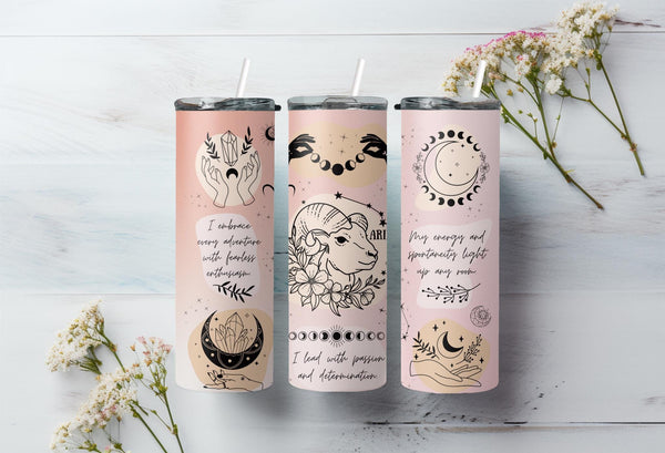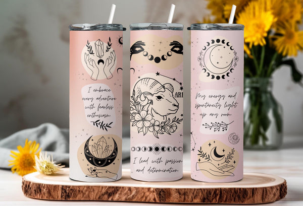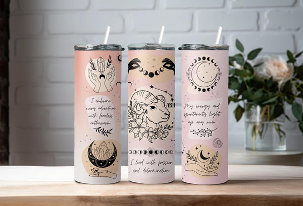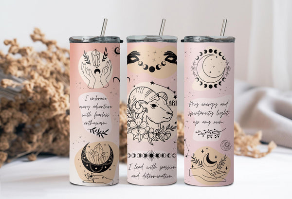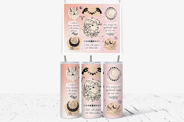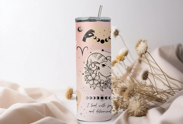 Stay hydrated and inspired with our Aries Zodiac Sign Tumbler! Keep your drinks hot for up to 6 hours and cold for up to 24 hours. Customize with a name and proudly show off your Aries zodiac sign. Refreshment and self-expression in one stylish tumbler!