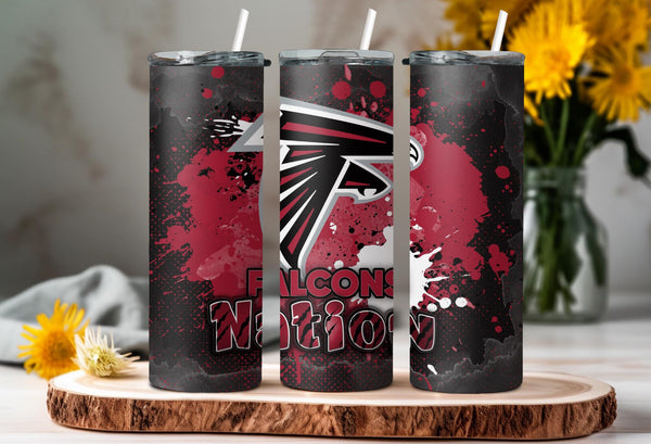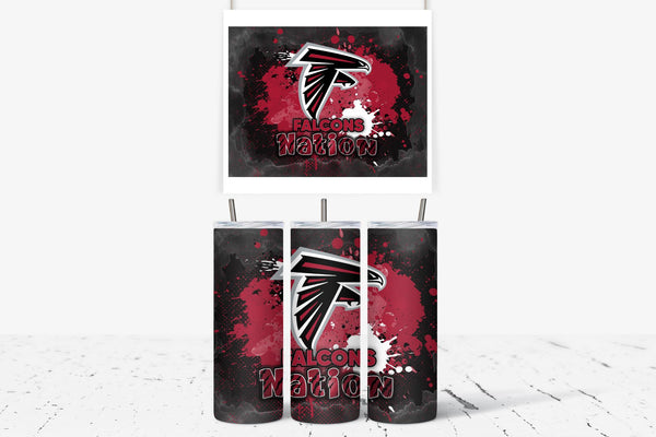 Falcons Nation: A gritty, high-energy design featuring a black background with red paint splatters and bold "Falcons Nation" text.