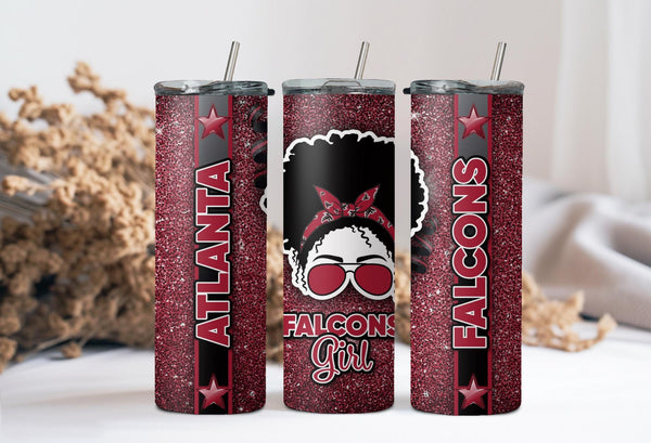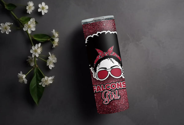Atlanta Football Girl 20oz Skinny Tumbler, Red & Black Glitter Cup, Afro Puff, Football Mom