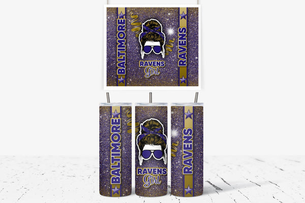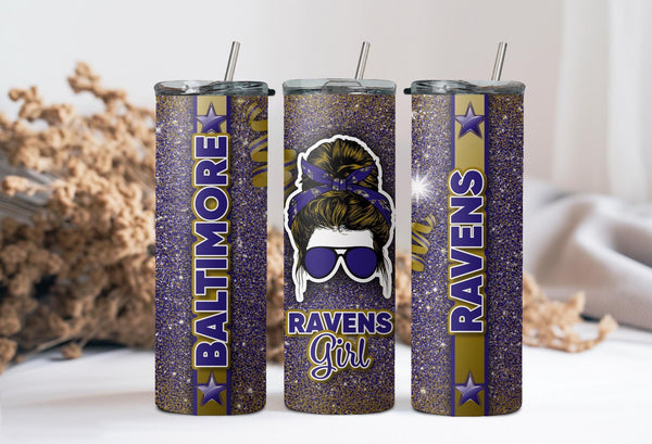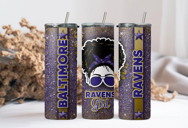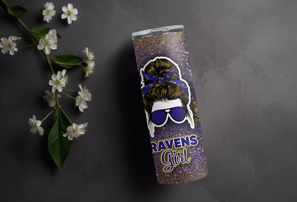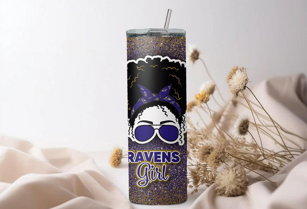 Featuring a vibrant purple and gold faux-glitter background and the stylish "Ravens Girl" logo, this cup is the ultimate accessory for any fan in Charm City.