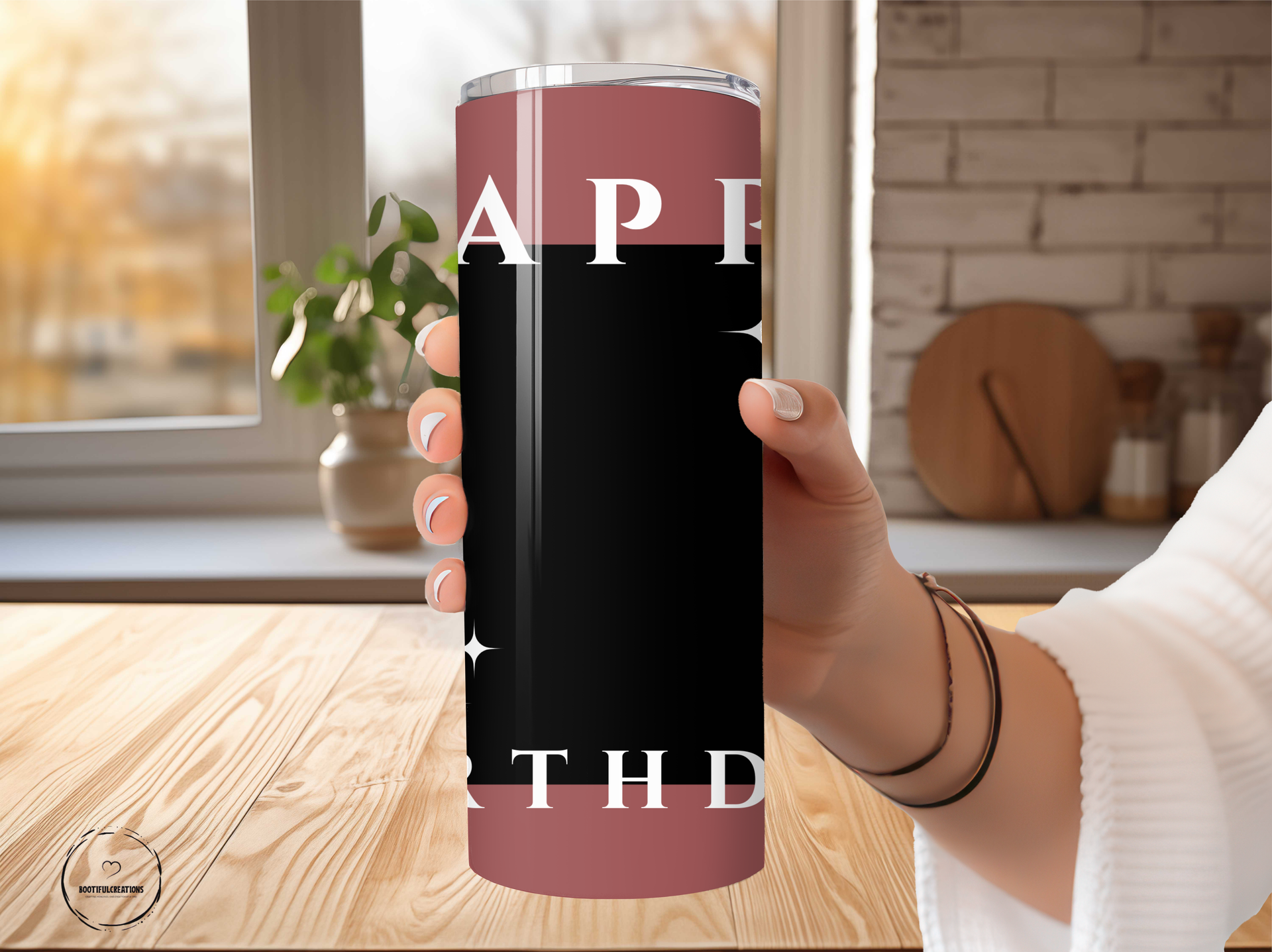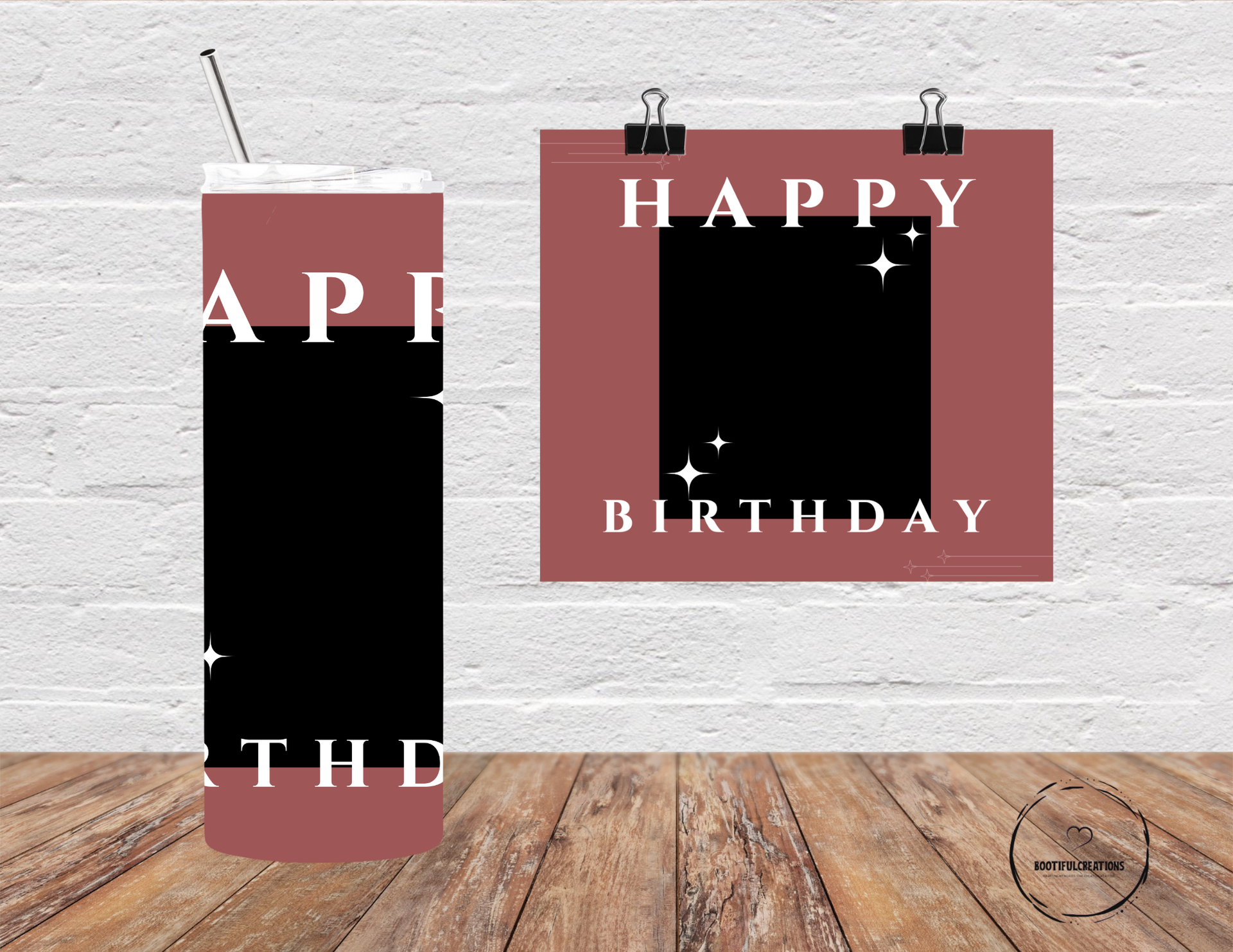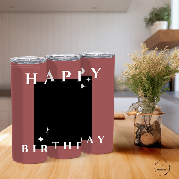 Celebrate the special day with Birthday Bliss! Personalize this stunning maroon tumbler with a photo and recipient's name. Bold white letters spell out "HAPPY BIRTHDAY," making it an eye-catching gift. Keep drinks hot for up to 6 hours or cold for up to 24 in this versatile tumbler.